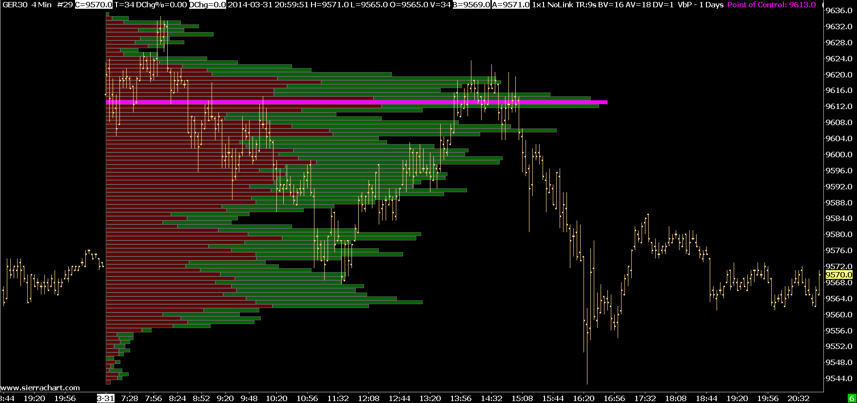 We have looked this over and this is what we get: http://www.sierrachart.com/image.php?l=1396325405806.png Same as you. Therefore, there must be some difference in the settings for the Volume by Price study you are comparing to. We need to know what they are using. The easiest way to accomplish this is to ask them for their Chartbook file. Here are the instructions for this: https://www.sierrachart.com/index.php?l=doc/doc_Chartbooks.html#CopyChartbook In the case of the EUREX, you definitely will not get a better data feed with IQ Feed. We have been studying the EUREX data the last couple of months in regards to bid traded volume and ask traded volume and have come to conclude, that there is no 100% accurate data feed out there for the EUREX. Bid and Ask volume can only be estimated. Currently the way that the Sierra Chart EUREX data feed works now, it has a very good algorithm for this. Definitely better than IQ Feed. Sierra Chart Support - Engineering Level Your definitive source for support. Other responses are from users. Try to keep your questions brief and to the point. Be aware of support policy: https://www.sierrachart.com/index.php?l=PostingInformation.php#GeneralInformation For the most reliable, advanced, and zero cost futures order routing, *change* to the Teton service: Sierra Chart Teton Futures Order Routing Date Time Of Last Edit: 2014-04-01 04:14:53