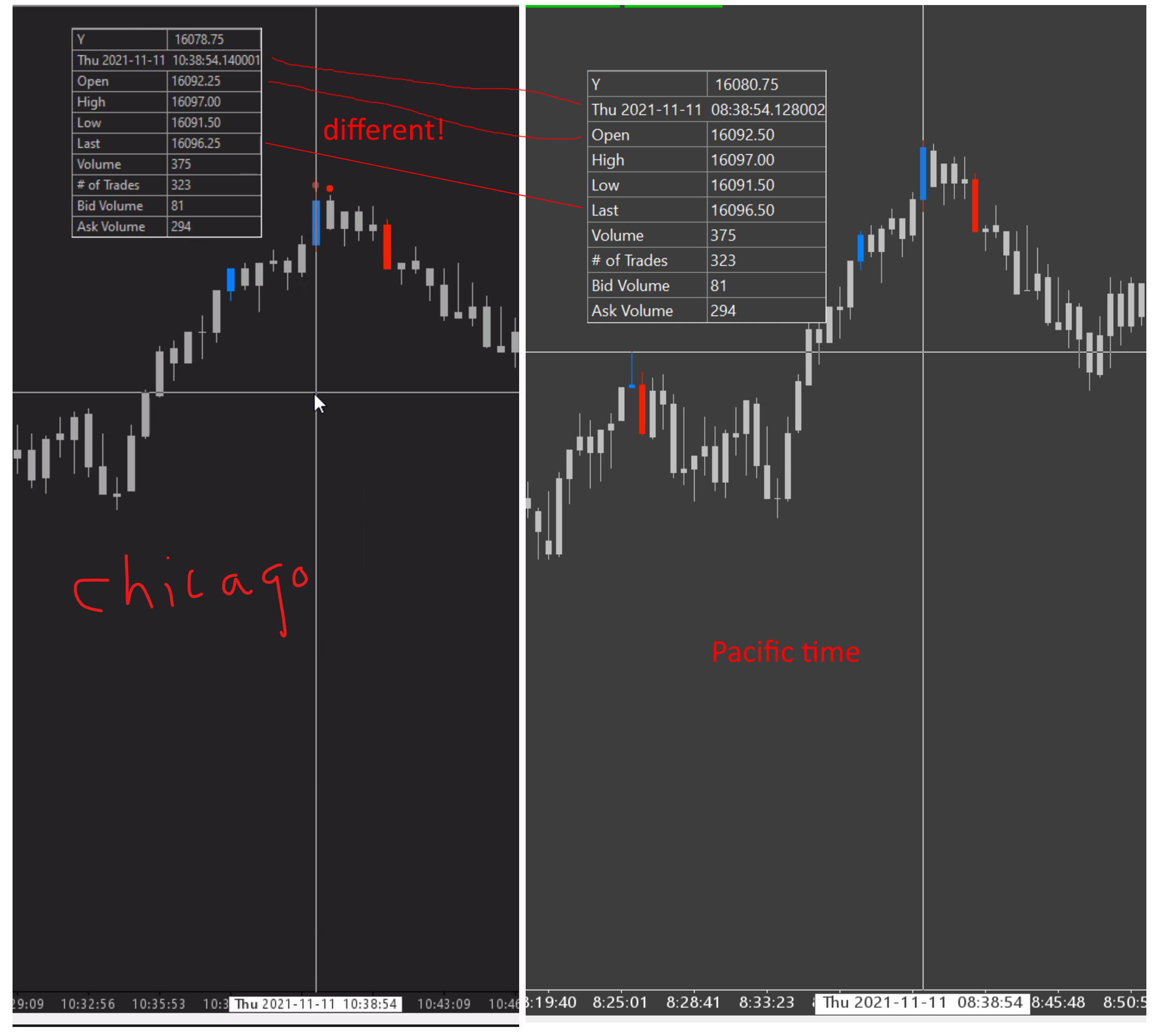 We have noticed data differences between myself and another user even though we have identical settings and are using Denali data. We checked same settings, system clocks/timezones, and our bars on a 375 Volume NQ chart do not match. See the image at https://i.imgur.com/nMACb8n.png that shows the issue. In this case, the times are off and the bar is off by 1 tick. We have seen a much larger discrepancy in XBTUSD which we are still gathering data for. Using the same studies, we are not getting the same signals from the indicators because the bars do not match. In all cases, the charts are set to draw a new bar at the globex open at 15:00 pacific/17:00 chicago. It appears that opening bar is correct, and after sometime, maybe before RTH open when volume picks up, the data starts to not match. This is actually the time it is most important for it to match. Why would there be differences in the data different users see when they have the same settings? This is a major issue with the reliability and quality of the data that needs to be addressed to maintain user trust. Please let me know how we can help troubleshoot further, and how we can ensure that two users with the same settings always see the exact same data on their charts. |