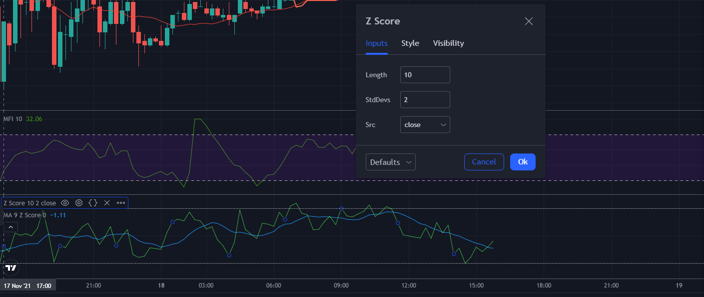 https://i.ibb.co/RymHCLQ/Capture.png Sierra Chart https://i.ibb.co/9HkpR9W/image.png Thinkorswim https://i.ibb.co/WGpj3mB/Capture1.png TradingView These are all screenshots of the same period of time with the same length (10),the same SD2 and the same source Last/close (2) . All Im saying is that your Z-score has a strange scale and range and I want to exclude these dramatic bottoms and tops you see at the screenshot Date Time Of Last Edit: 2021-11-23 13:44:23
