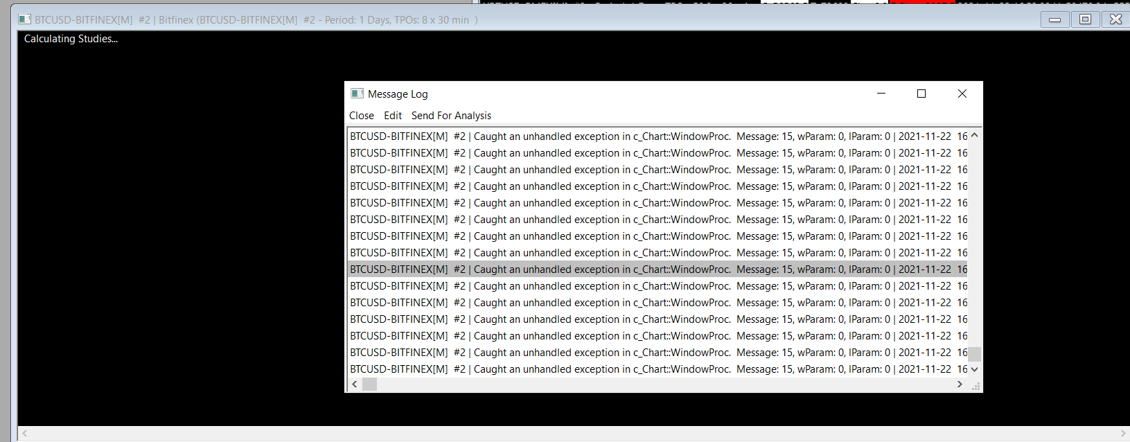 This exception is related to graphics output. If you are using OpenGL, disable it: Graphics Settings: Use OpenGL for Chart Graphics (Global Settings >> Graphics Settings >> Other) Sierra Chart Support - Engineering Level Your definitive source for support. Other responses are from users. Try to keep your questions brief and to the point. Be aware of support policy: https://www.sierrachart.com/index.php?l=PostingInformation.php#GeneralInformation For the most reliable, advanced, and zero cost futures order routing, *change* to the Teton service: Sierra Chart Teton Futures Order Routing |