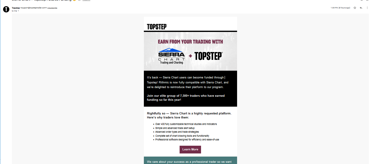 Dear SC: I got an email from TopstepTrader saying Rithmic is now fully compatible with SC and they are re-introducing SC as a Topstep platform. (see image, attached). Is it true? If so, do I need to step up to any particular release of SC? Also, re: set up, does Topstep need to do it or can I do it at my end thru SC? Thank you. |