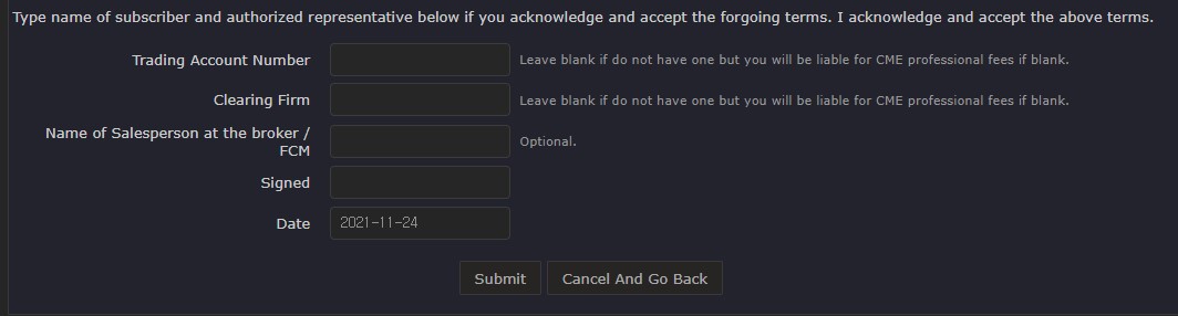 Easy Solution to CME Funded Trading Account Requirement --------------------------------------------------------------------- "This solution is also recommended when you want to use the Sierra Chart Simulated Futures Trading Service with real-time data and you do not yet have a funded futures trading account. This is an easy way to obtain the real-time CME Group data at the lower cost nonprofessional fees with a minimum trading account balance." So, in this case, how do I fill in [Uniform Subscriber Agreement]? I have upgraded Service Package to 11. Date Time Of Last Edit: 2021-11-25 10:27:16