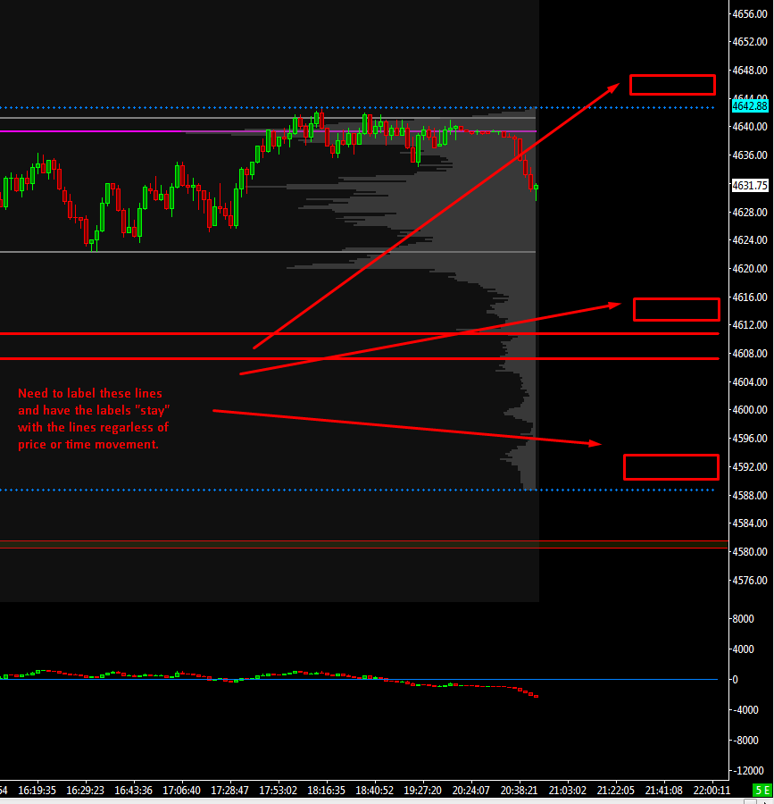 Thanks for your help. I cannot upgrade to the latest version because I'm running a 32 bit system. However, I figured it out on my current version 2138. Using the horizontal ray tool, extension to the right, adjust to whatever color/style you want. Then right click the drawing and "modify text." The text label stays in the right margin space (attached to the ray/line) no matter what happens with the chart. Doesn't matter if you scroll, if the chart advances over time, or if you switch to the overnight session. The line and label stays. I have included a screen shot. Date Time Of Last Edit: 2021-12-27 18:22:30