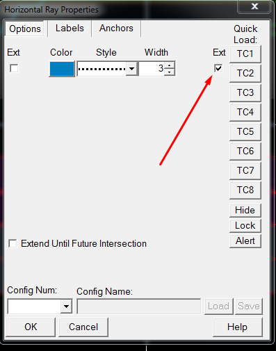No, just using the "line" tool. I can label the line prior to extending it, but when I hit "extend drawing" the label disappears. Extending the line is the only way I can stop it from scrolling with the chart, as the chart advances. In other words, I CAN draw lines with labels, but as time advances, I have to keep manually extending the lines to the right throughout the day. (to keep the labels on the right.) |