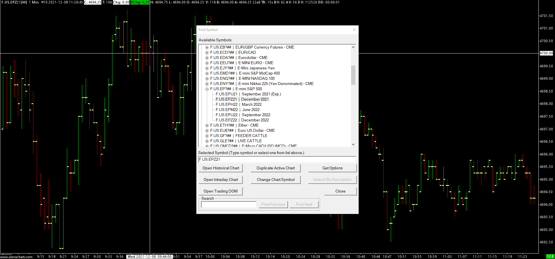 There is really something I don't get ! I follow your instruction and I confirm the symbol is EPZ21 as you can see below. And I am trading this symbol for months without trouble ! https://www.sierrachart.com/image.php?Image=1638959209727.png |