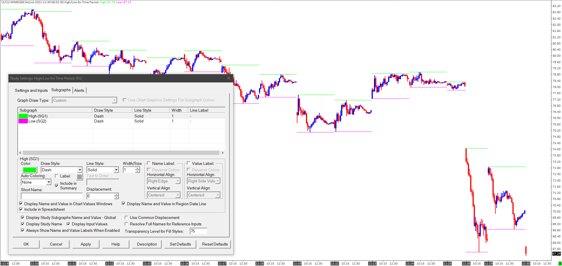 Not dashed 'line style' - Drawstyle Dash >>>> Chart Studies: Dash (ACSIL: DRAWSTYLE_DASH) I am also using range bar charts with these studies. Date Time Of Last Edit: 2021-11-30 15:02:55
