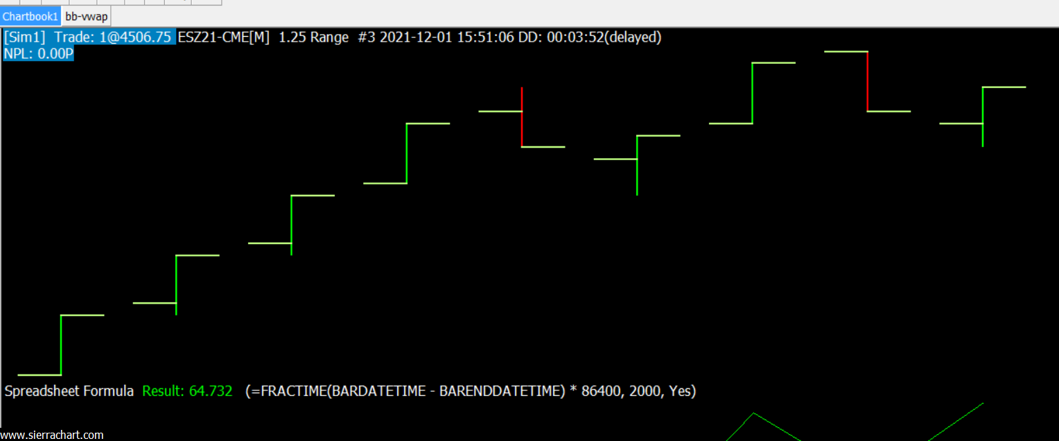 It looks like the time is just too small to use the method we gave you. Rather, enter the following formula in your Spreadsheet Formula study to get the bar duration in seconds(and you can get rid of the Numbers Bars Calculated Values, unless you want to the see the information in there as well): =FRACTIME(BARDATETIME - BARENDDATETIME) * 86400 For the most reliable, advanced, and zero cost futures order routing, use the Teton service:  Sierra Chart Teton Futures Order Routing  |