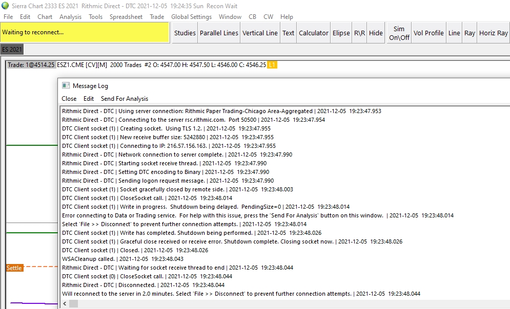 Hi Sierra Support I did some adjustments and the freezing is not as pronounced now. Was able to trade fine on Friday morning. I had made a post a couple weeks ago regarding the Rithmic Bridge plug in which I was told was not used in the new version and was given a whole guideline what to do. I have done everything, including upgrading to denali and direct CME data for ES. I was logging in with the rithmic credentials and it was working good. But tonight for some reason it is refusing to connect. When I switch to Sierra SC Data or to my CQG connection for Tradovate it connects no problem. But for some reason Rithmic, which was connecting yesterday is now stuck on the yellow status. I took a screenshot of the log. Any idea what is wrong? Thanks |