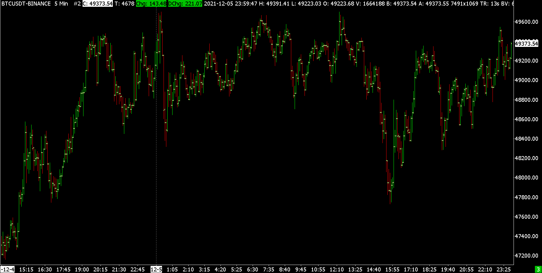 For BTCUSDT-BINANCE This is what we see currently: Current Quote BTCUSDT-BINANCE 2021-12-05 23:58:15.305 Sun LastPrice: 49330.05 LastSize: 94 Daily Price Chg: 177.58 | 0.36% Ask: 49330.06 Bid: 49330.05 Bid Ask Avg: 49330.05 Bid Ask Diff: 0.8 Ticks Bid x Ask: 1447 x 2888 Daily Open: 49152.46 Daily High: 49699.05 Daily Low: 47727.21 Previous Close: 49152.47 Daily Volume: 442330494 Num Trades: 241653 The daily low matches with the Intraday chart for the date 2021-12-05 UTC: https://www.sierrachart.com/image.php?Image=163874878920.png We are definitely not seeing any issue. Sierra Chart Support - Engineering Level  Your definitive source for support. Other responses are from users. Try to keep your questions brief and to the point. Be aware of support policy: https://www.sierrachart.com/index.php?l=PostingInformation.php#GeneralInformation For the most reliable, advanced, and zero cost futures order routing, *change* to the Teton service: Sierra Chart Teton Futures Order Routing  |