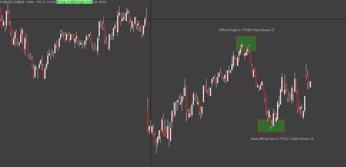 Hello again, I) I have similar issue, I see the same thing as the other user - yesterday (Dec 7th) after the Eurex close, the Bund 0322 contract high was at 174.57 which changed to the official high of 174.60 when I opened the platform today. The same happend to Dec 7th low, which yesterday after Eurex close was at 174.05 and today in the morning it is suddently displayed at 174.06. Could you please explain? II) Would it be possible to add an option to use settlement for the rollover calculation? Thank you. H. Date Time Of Last Edit: 2021-12-08 11:25:07