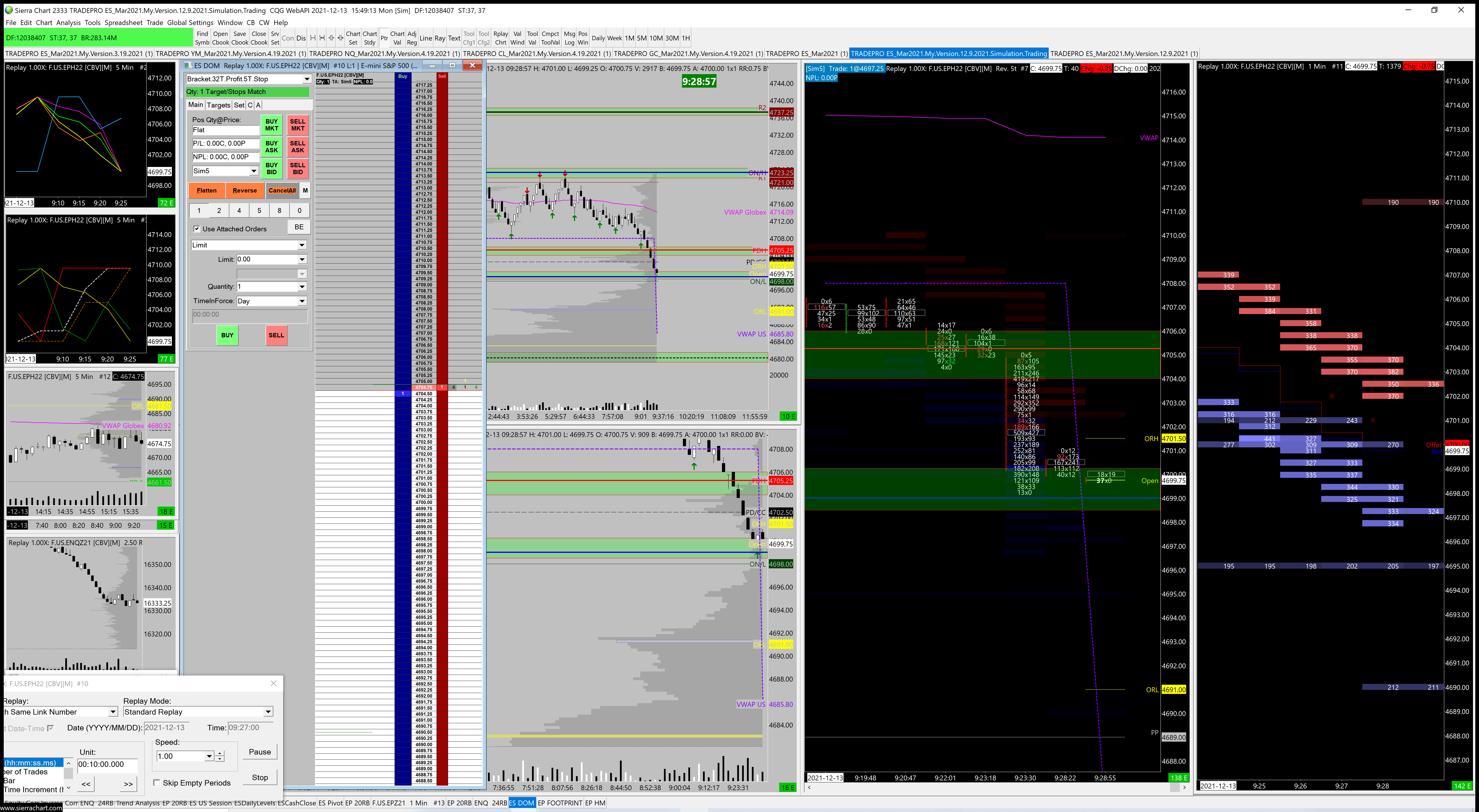 Thank you. I tried that but I'm still having a problem with the Dom not having the correct price levels when I'm in replay mode.  If you can view the image below, you can see that that I'm in replay mode and the price levels of the other charts are correct but the price levels of the DOM are not correct.   All charts have the same linking number and are set to the same contract (Continuous, Volume based). https://www.sierrachart.com/image.php?Image=1639428050507.png | 2021-12-13 15:40:51.211  |