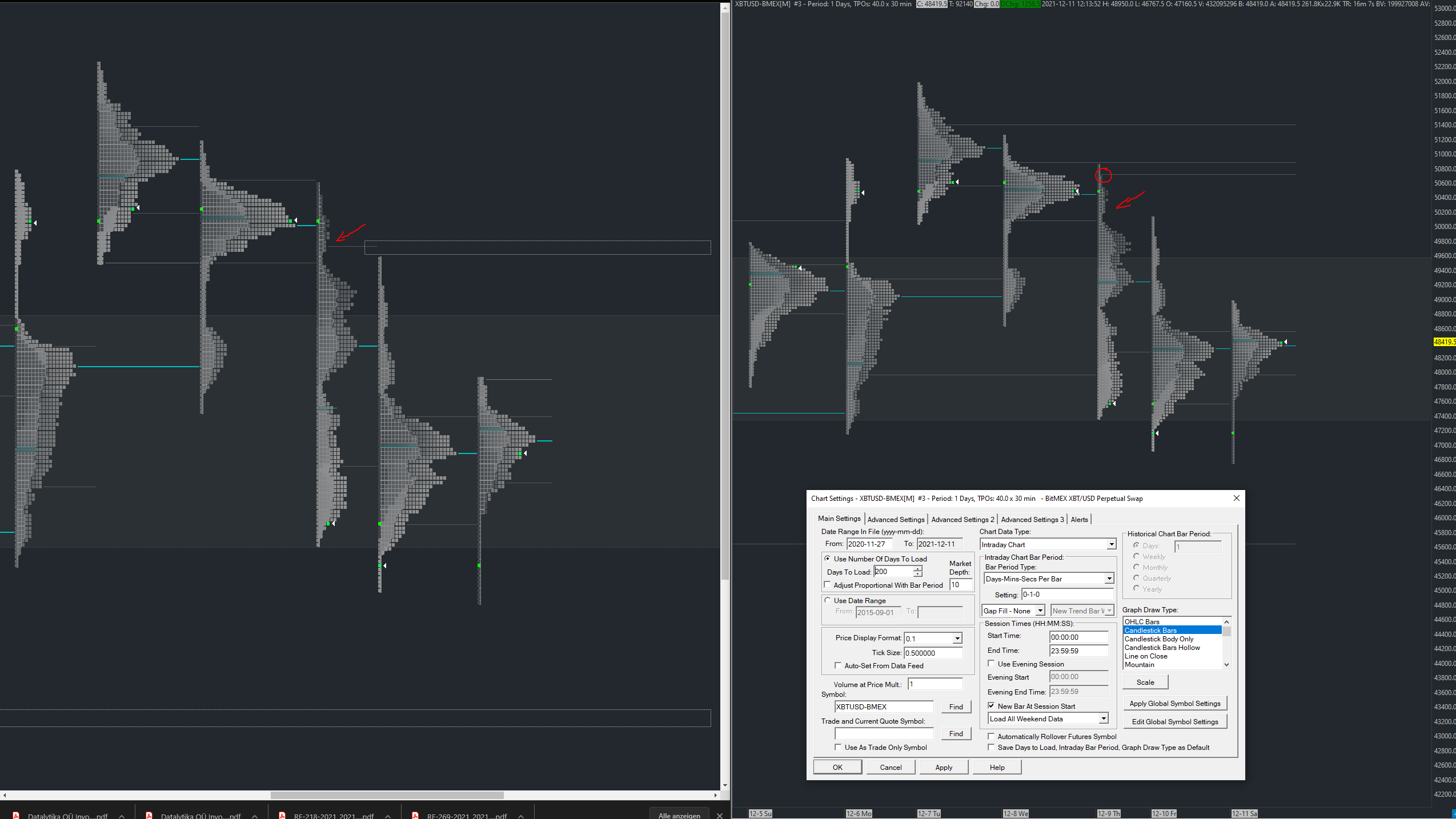 Hi, there should be bad highs on todays profile but for some reason Sierra Chart is not showing them to me in the TPO chart. Please can you assist me what I need to adjust/change to see them in the chart? Besides that I am also missing to see the correct placement of the nVAH. In the attached picture you see the correct picture on the left and my screenshot plus settings on the right. Bad Highs on todays profile are missing on my chart. BTW, we are using the same template. Chart >> Chart Settings >> Advanced Settings 3 >> Combine Trades Into Original Summary Trade -> did not change anything and we have the data feeds.