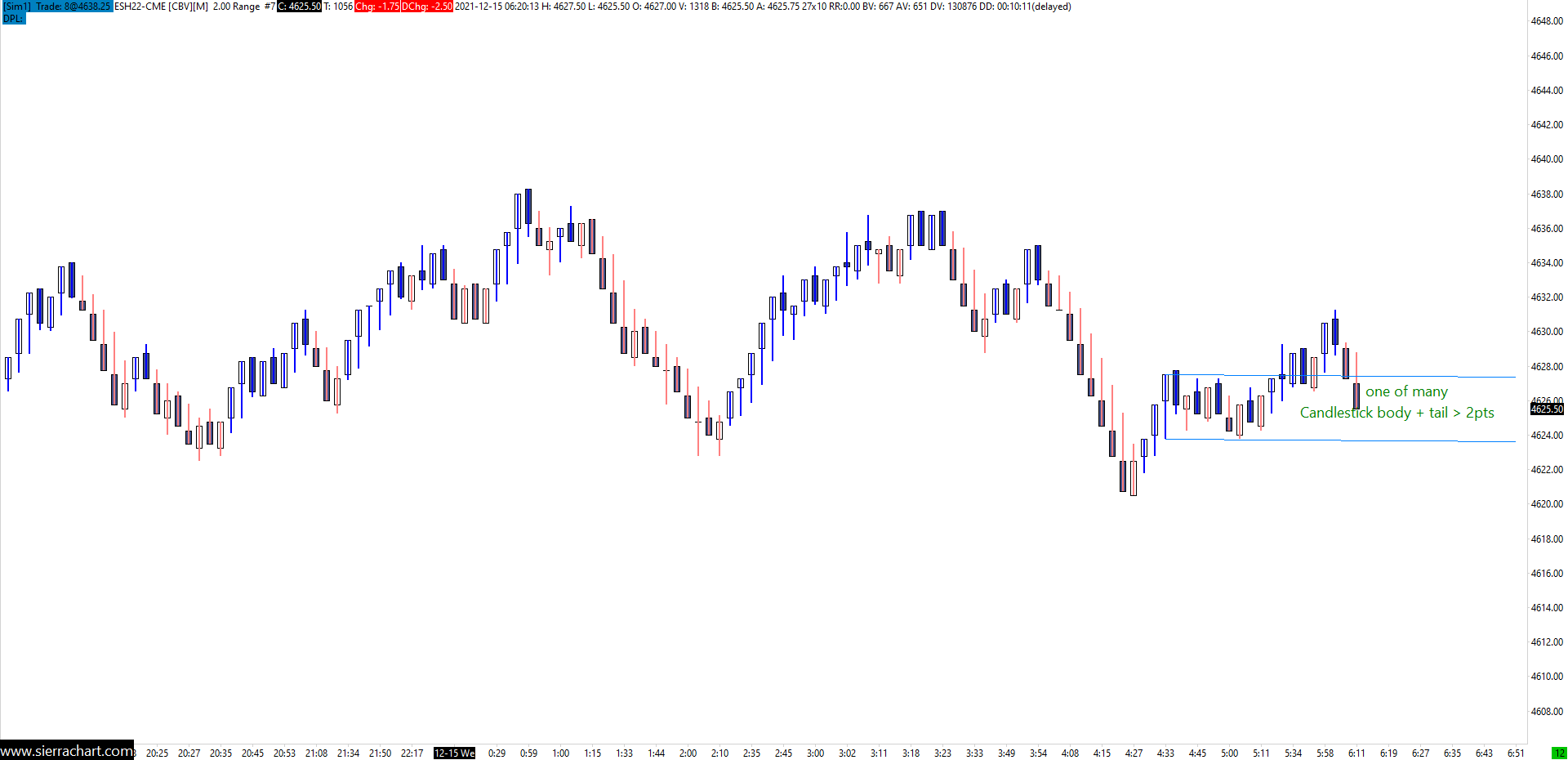 Hi, I am plotting ES-MINI March 22 futures contract with Candlestick Bars Tick size .25 Using Range Per Bar - Standard (in ticks), Settings to 8. Yet many of my candlestick bars (including tail) are more than 2 points range? Not sure how to fix this. Footprint - works fine with this setting which is identical Please help Stephen  |