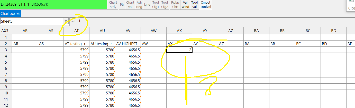 seeing something ive never seen before... i have a spread sheet study attached to a 5 min chart ive been using this sheet for some time now and havent changed any settings since i attached it i attempted to enter a formula in a column at row 3. it accepts the formula as usual however, it doesnt populate the colunm below row 3 when I select 'RECALUATE ALL FORMULAS', the formula i added to row 3 is cleared. I attempted to attach a picture...dont know if it sent. any assistance appreciated |