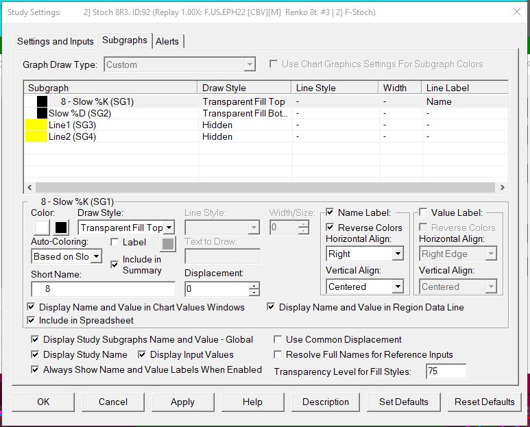 The colors of the Labels is going to follow the colors for the particular subgraph. In this case, the color options are black and white. One of your options is to uncheck "Reverse Colors" and see if that will give you what you want. Otherwise the only other option would be to use either another copy of the same study (with the exact same Inputs) or the Study Subgraph Reference Study, but set the Subgraph Draw Type to Subgraph Name and Value Labels Only. Then you can set the colors as you desire and get the labels as you want and not impact the original lines that you have. Refer to the following for the "Subgraph Name and Value Labels Only" Draw Type: Chart Studies: Subgraph Name and Value Labels Only (ACSIL: DRAWSTYLE_SUBGRAPH_NAME_AND_VALUE_LABELS_ONLY) For the most reliable, advanced, and zero cost futures order routing, use the Teton service: Sierra Chart Teton Futures Order Routing |