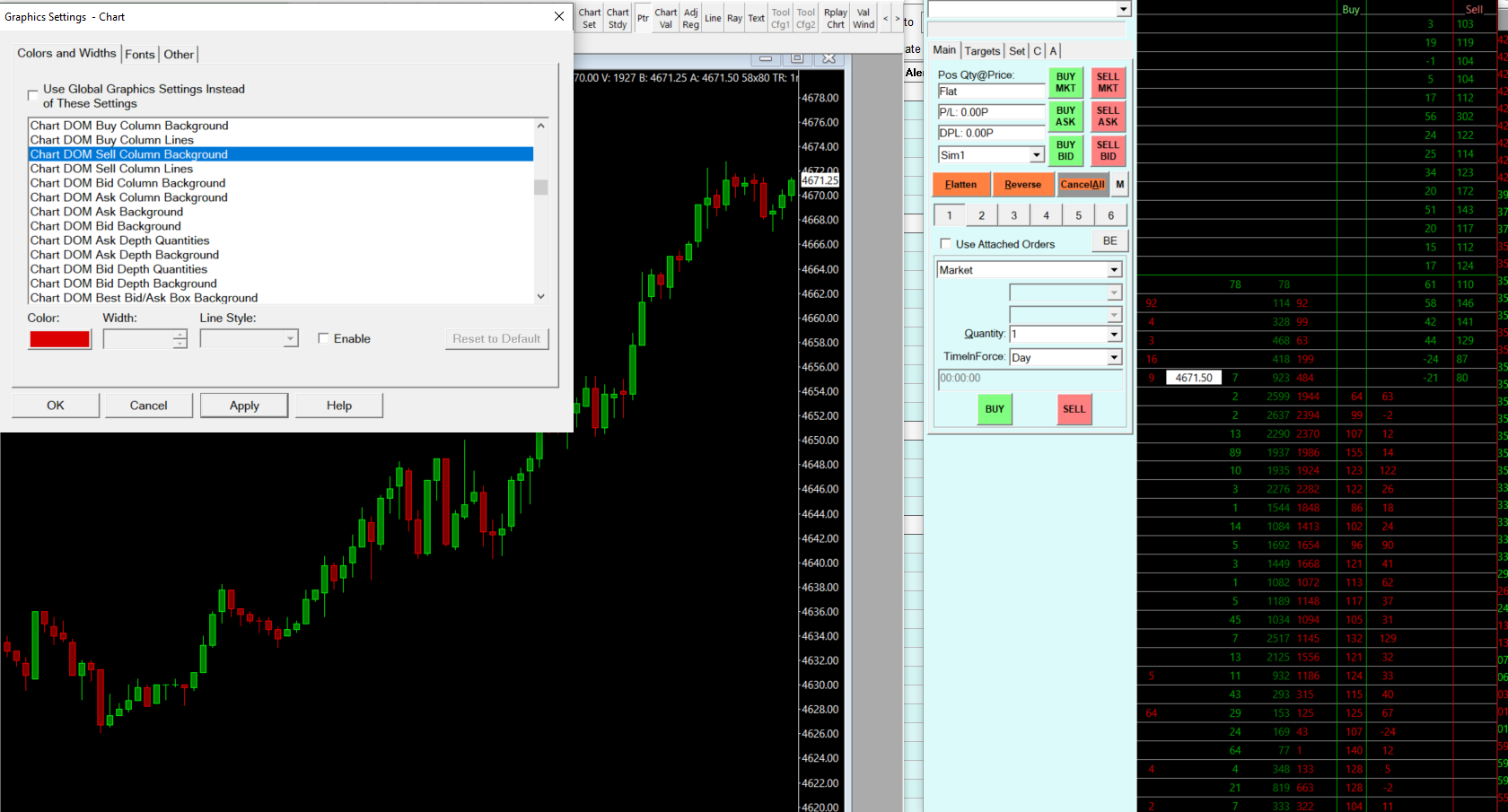 Notice to the right of that color setting where it says "Enable". Enable that checkbox. And yes you would need to use the Trade DOM equivalent setting as well. And make sure you are opening the Graphics Settings window, for that particular trading DOM. Sierra Chart Support - Engineering Level Your definitive source for support. Other responses are from users. Try to keep your questions brief and to the point. Be aware of support policy: https://www.sierrachart.com/index.php?l=PostingInformation.php#GeneralInformation For the most reliable, advanced, and zero cost futures order routing, *change* to the Teton service: Sierra Chart Teton Futures Order Routing Date Time Of Last Edit: 2021-12-22 17:30:40