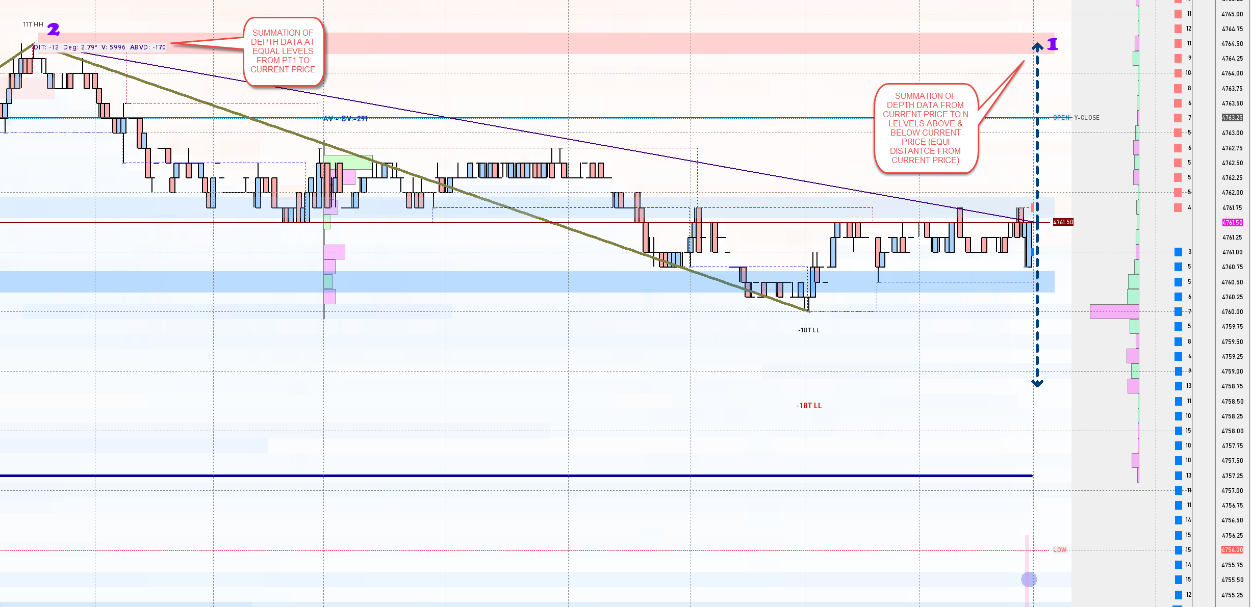 1) The best exact calculation is a new depth interactive drawing tool as shown in the attached drawing (1) to display 2 summations of depth from the current price level to n level above & below it. 2) The 2nd best is using a chart calculator w/ added 2 summations of depth from starting price level to current price level (equidistance) as marked as (2). The 1st implementation has all freedom to do everything at the current price level w/o limitations of the chart calculator attaching to past data so I think it's the best but I'm not the designer so I have no idea of the constraints u guys have. Thanks for looking into it. |