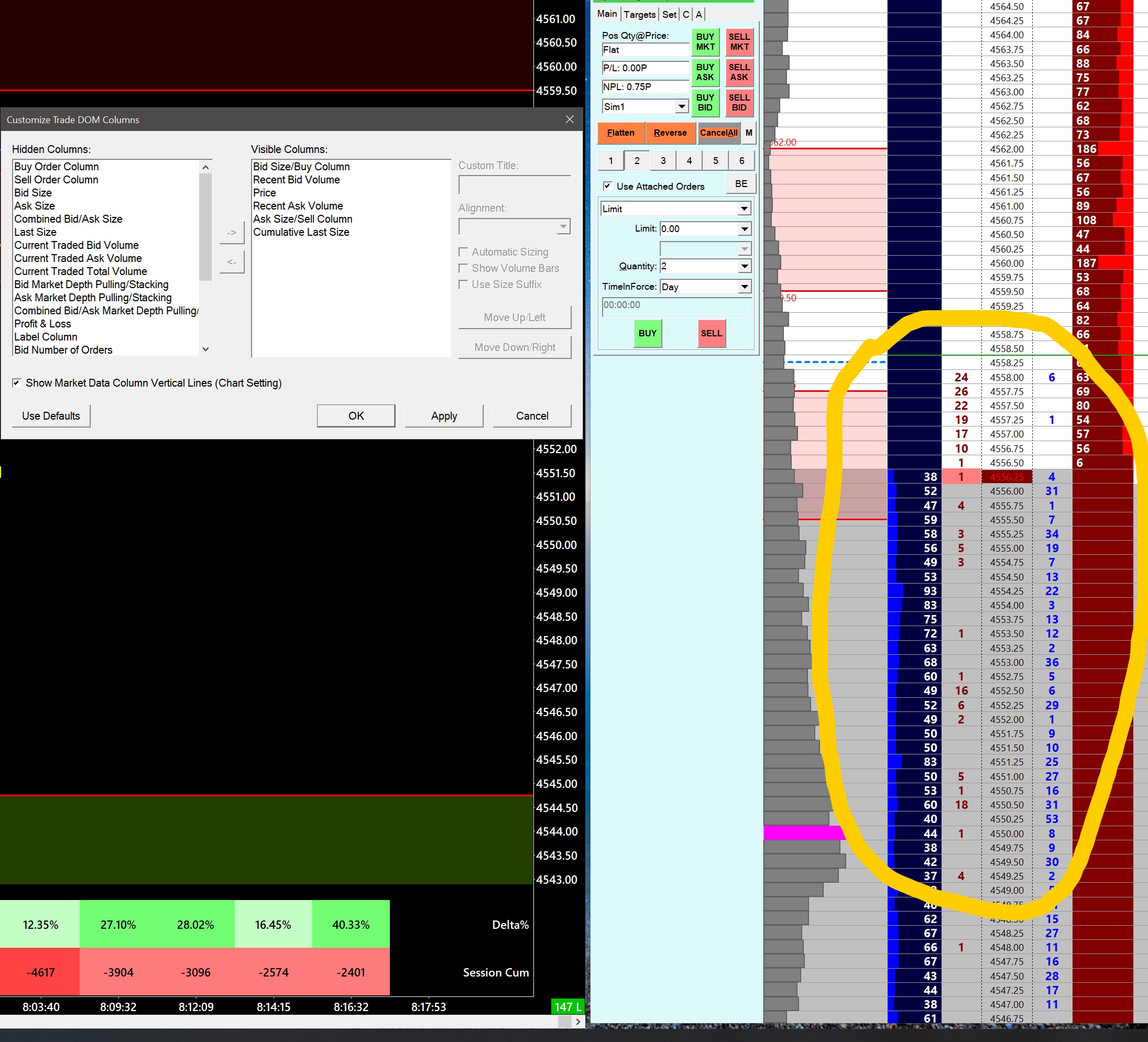 I am using ES and im looking to have the limit order columns(dark blue and red) and the actual traded orders (inner columns) on my DOM, but the numbers seem low for ES . This pic is from RTH. I attached a pic to show my settings. Let me know thank you!
