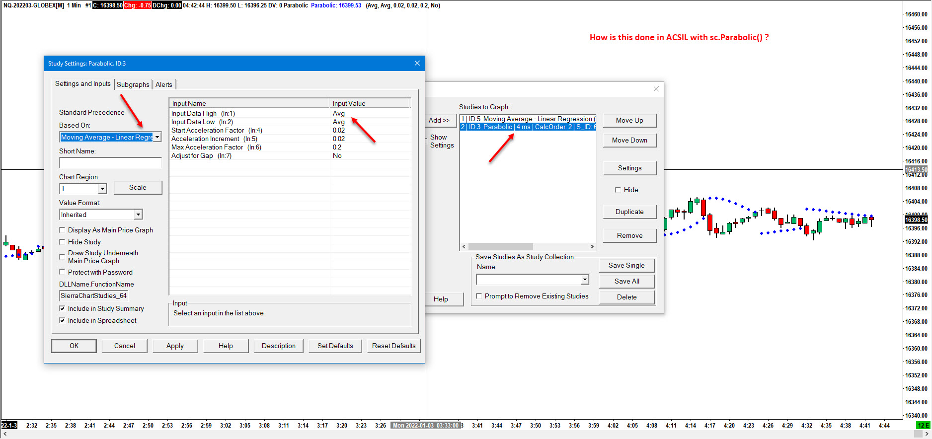 Attached is a chart showing Parabolic SAR applied to a Moving Average. (attached is a chart) How do you apply a Parabolic to a Moving Average in ACSIL ? Current code with SC.Parabolic() example included: #include "sierrachart.h" SCDLLName("PSAR_MA") SCSFExport scsf_PSAR(SCStudyInterfaceRef sc) { // SCSubgraphRef Subgraph_Parabolic = sc.Subgraph[0]; SCSubgraphRef RL10_Parabolic = sc.Subgraph[1]; SCSubgraphRef RL_10 = sc.Subgraph[2]; SCInputRef Input_InputDataHigh = sc.Input[0]; SCInputRef Input_InputDataLow = sc.Input[1]; SCInputRef Input_StartAccelerationFactor = sc.Input[2]; SCInputRef Input_AccelerationIncrement = sc.Input[3]; SCInputRef Input_MaxAccelerationFactor = sc.Input[4]; SCInputRef Input_AdjustForGap = sc.Input[5]; SCInputRef RL_10Period = sc.Input[6]; if (sc.SetDefaults) { // Set the sub-graph configuration and defaults sc.GraphName = "PSAR"; sc.StudyDescription = "Parabolic Stop and Reverse applied to a MA not price"; sc.DrawZeros = false; sc.GraphRegion = 0; sc.ValueFormat = VALUEFORMAT_INHERITED; sc.AutoLoop = 1; /* Subgraph_Parabolic.Name = "Parabolic"; Subgraph_Parabolic.DrawStyle = DRAWSTYLE_POINT; Subgraph_Parabolic.LineWidth = 3; Subgraph_Parabolic.PrimaryColor = RGB(0,0,0); */ RL10_Parabolic.Name = "RL10 Parabolic"; RL10_Parabolic.DrawStyle = DRAWSTYLE_POINT; RL10_Parabolic.LineWidth = 3; RL10_Parabolic.PrimaryColor = RGB(0,0,255); Input_InputDataHigh.Name = "Input Data High"; Input_InputDataHigh.SetInputDataIndex(SC_HIGH); Input_InputDataLow.Name = "Input Data Low"; Input_InputDataLow.SetInputDataIndex(SC_LOW); Input_StartAccelerationFactor.Name = "Start Acceleration Factor"; Input_StartAccelerationFactor.SetFloat(0.02f); Input_StartAccelerationFactor.SetFloatLimits(0.000001f,(float)MAX_STUDY_LENGTH); Input_AccelerationIncrement.Name = "Acceleration Increment"; Input_AccelerationIncrement.SetFloat(0.12f); Input_AccelerationIncrement.SetFloatLimits(0.00001f, 100.0f); Input_MaxAccelerationFactor.Name = "Max Acceleration Factor"; Input_MaxAccelerationFactor.SetFloat(0.2f); Input_MaxAccelerationFactor.SetFloatLimits(0.000001f,(float)MAX_STUDY_LENGTH); Input_AdjustForGap.Name = "Adjust for Gap"; Input_AdjustForGap.SetYesNo(0); // No RL_10Period.Name = "RL10 Period"; RL_10Period.SetInt(10); return; } // Calculate RL MA sc.DataStartIndex = 1 ; sc.MovingAverage( sc.BaseDataIn[SC_LAST], RL_10, MOVAVGTYPE_LINEARREGRESSION, RL_10Period.GetInt()); ///// Parabolic applied to a moving average as per Chart Setup.JPG sc.Parabolic( RL_10, sc.BaseDateTimeIn, RL10_Parabolic, sc.Index, Input_StartAccelerationFactor.GetFloat(), Input_AccelerationIncrement.GetFloat(), Input_MaxAccelerationFactor.GetFloat(), Input_AdjustForGap.GetYesNo(), Input_InputDataHigh.GetInputDataIndex(), Input_InputDataLow.GetInputDataIndex() ); } The standard SC Parabolic function is as follows: */////////////////////////// Standard Sierra Chart Parabolic code as an example sc.Parabolic( sc.BaseDataIn, sc.BaseDateTimeIn, Subgraph_Parabolic, sc.Index, Input_StartAccelerationFactor.GetFloat(), Input_AccelerationIncrement.GetFloat(), Input_MaxAccelerationFactor.GetFloat(), Input_AdjustForGap.GetYesNo(), Input_InputDataHigh.GetInputDataIndex(), Input_InputDataLow.GetInputDataIndex() ); /*/////////////////////////// Standard Sierra Chart Parabolic code as an example There must be something very simple I am missing ? Thank you for your help Date Time Of Last Edit: 2022-01-08 16:06:05