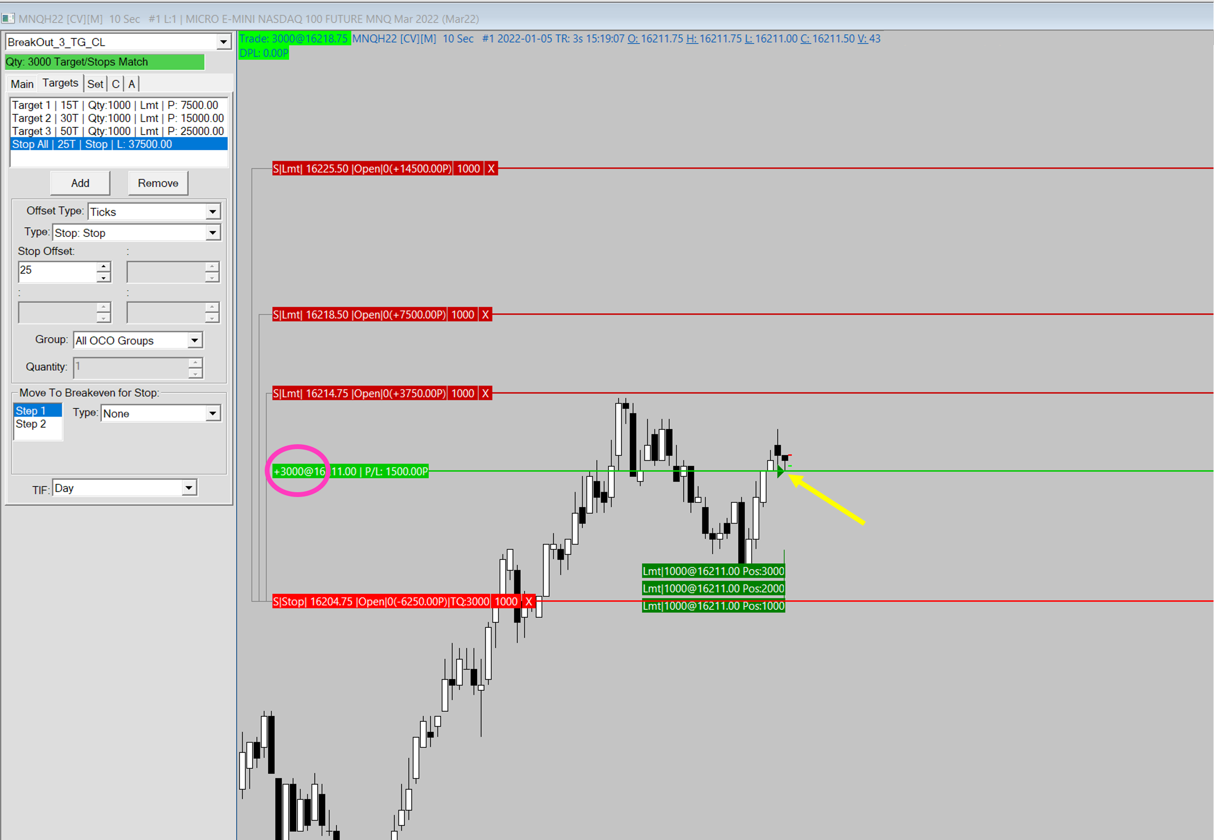 I have run into the very same problem as in the post #1. As far as we experienced and understand, the problem is twofold: 1. missing (at least I cannot find) implementation of partial fills in replay/evaluation environment 2. as a subsequence of missing partial fills: I cannot properly test/evaluate my trading system Let me clarify the problem to be solved thorough two examples; Example No1: Service: TradingEvaluator (RealTime) OrderManagement: SC Built-In Tools (No custom code, out-of-the-box OCO orders) Symbol: MNQH22 Entry: LMT Quantity: 3000 Question: If partial fills and related OCO-s are implemented and this environment simulates trading as if you were connected to a live trading account how can a spike of a 10second bar fill 3000 MNQ contracts? It is definitely not the same as being connected to a live account. Notes: Using Replay Mode the problem is the very same (using “Calculate At Every Tick/Trade”) Using Custom code is the very same, too. The example above (see attached pictures) deliberately uses SC built-in tools to avoid and exclude coding errors. Example No2: Service: InteractiveBrokers (RealTime) OrderManagement: SC Built-In Tools (No custom code, out-of-the-box OCO orders) Symbol: MNQ-202203-GLOBEX-USD Entry: LMT Quantity: 200, Partially filled 12 Being connected a live account it is the situation. LMT orders often fill partially Question: Where and exactly what shall I set (Replay, Evaluator, Service, any other) to get exactly the same behavior as if I were in live trading? Any help highly appreciated. |