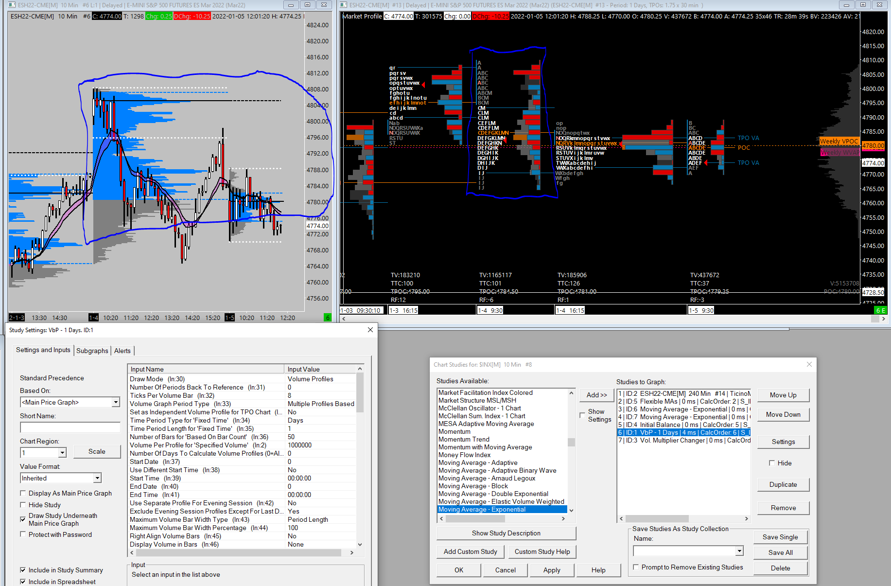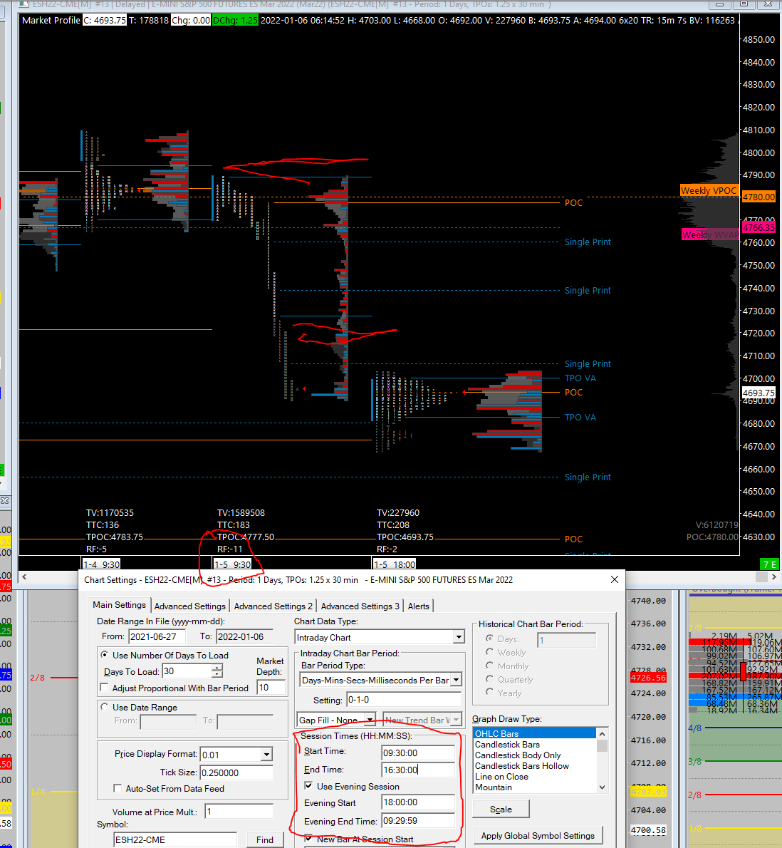 hello please let me know if possible , im trying to line up the TPO value area lines here from es, on the TPO study its correct, but on my chart on the left the sierra study "tpo value area lines" from the VBP study are incorrect. i have the candlestick chart study just set for day session, which is what i want but the value/POC lines are different. even tho the circled session on the TPO chart is just the day session from the 4th, you can see on the chart, the day session on the 4th is off. How can i make them match correctly without having to have my candlestick chart with the VBP study set to 24 hours? hopefully this made sense?? |