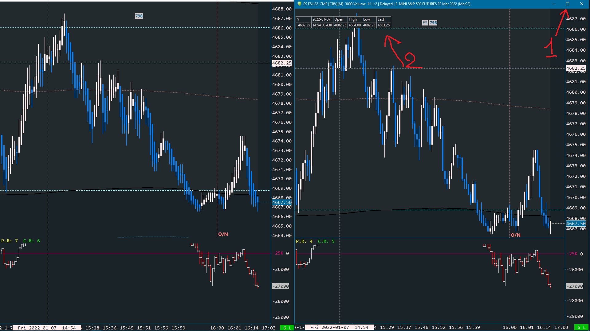 Yes sure, please find attached. Pic 1 is a view of 2 markets arranged vertically. When I click on the maximize button (N.1 - picture 1) the compact tool value (N.2 in picture 1) moves along with the enlarged window, such as in the upper left-hand corner) as shown in picture 2). The same goes when I restore down the window in order to monitor multiple markets. However, rather than clicking on the button (N.1 in picture 1), I have a keyboard shortcut to maximize the window and another one for restoring the window. When I use the keyboard shortcut, the compact tool value window stays in the same position (see Pic 3). This problem happens only on windows that are detached from sierra chart. Any windows maximized or restored through keyboard shortcuts within the instance, works just fine. Hope this has been useful to understand the issue. Look forward to hearing back from you. Regards, F |