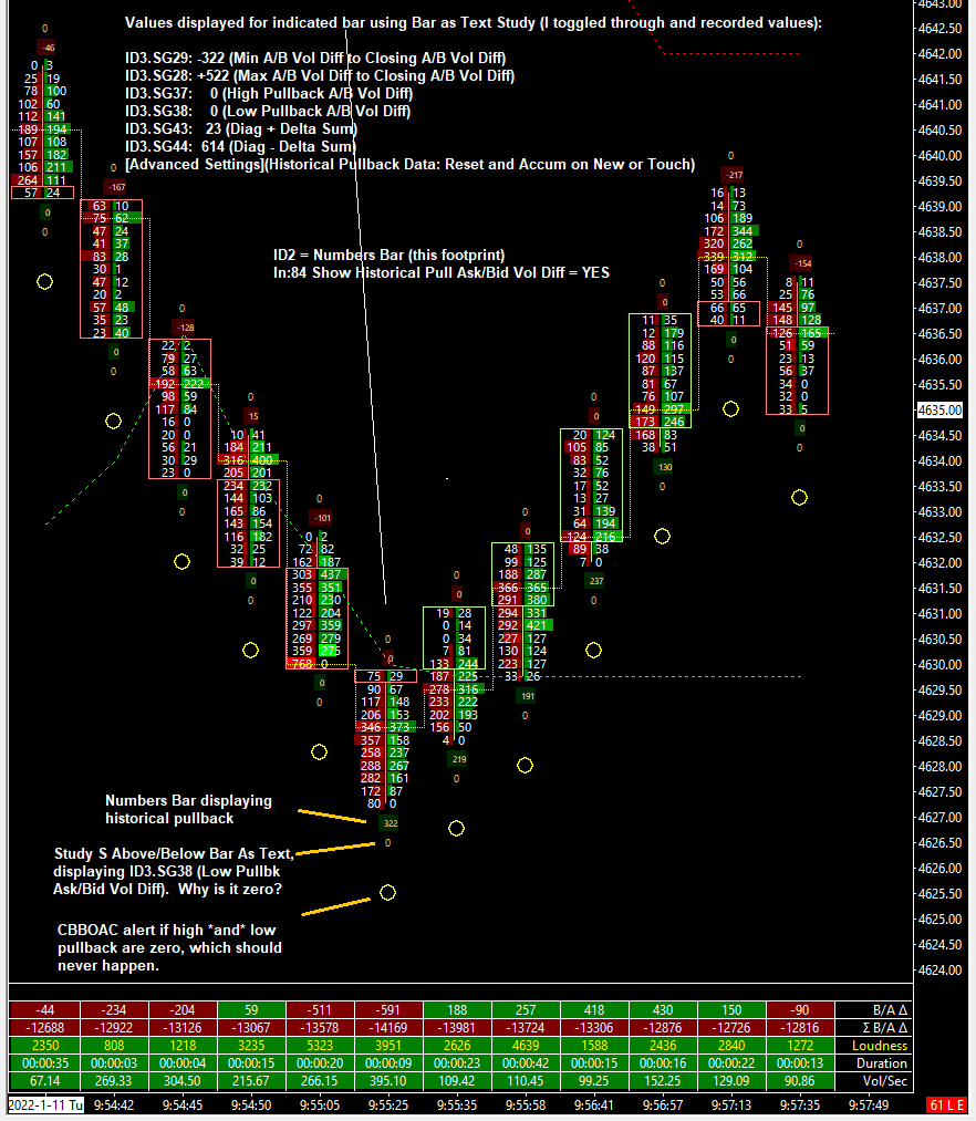 Problem Description: The Numbers Bar study is correctly displaying the Historical Pullback Ask/Bid Volume Difference in the chart display (In:84 = YES). However, both sets of numbers come back as zeros (0) when referenced from the Numbers Bar Calculated Values study. I do have historical pullback enabled (as evidenced by the values being displayed). I have attempted to display these values via Study Subgraph Above/Below Bar as Text, and they display as zero (0). I have also tried to reference them in a CBBOAC formula, and both sets of values evaluate to zero (0) each time. Please see the attached screenshots, as well as the privately attached chartbook. |