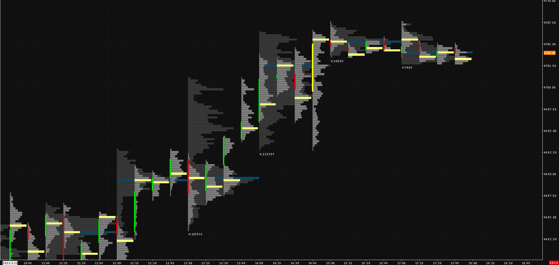 I'm inquiring if it's possible for me to implement one of my ATAS charts in Sierra Chart and, if so, how identical I can make it. It has 15 minute bars with histogram style profiles. Numerical values are disabled and the point of control has an outline. There's a volume filter that will color the price bar if over a certain number of contracts. There is a 1 hour profile behind the bars, with an outline to show the width/spread of price and a volume total. The 1 hour profile also has the point of control identified. Attached is an example of the chart. |