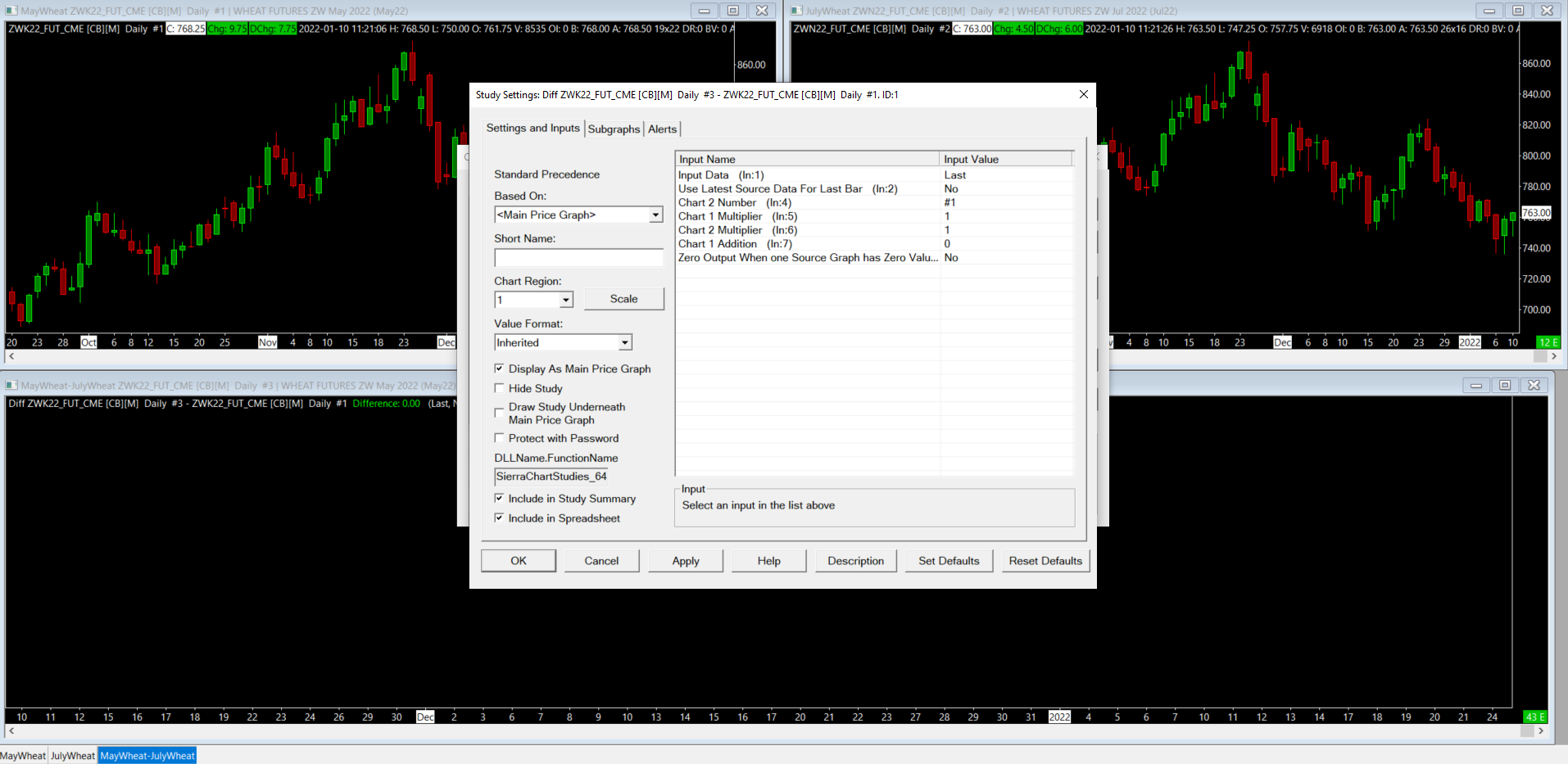 Was trying to create a spread chart using Difference Single Bar Study, for some reason not displaying. Here is picture of my settings. Main chart is ZWK22, chart #2 July. |