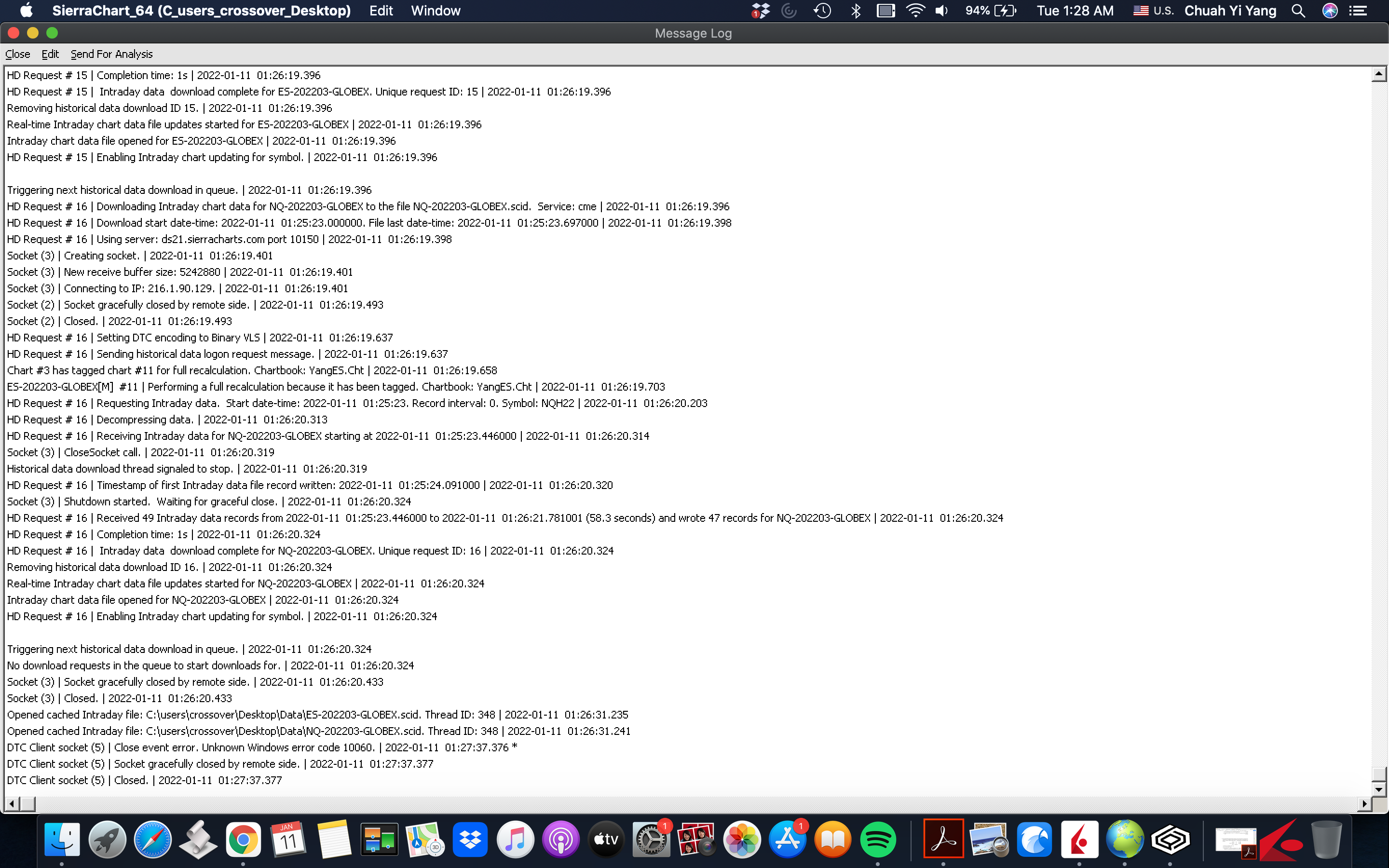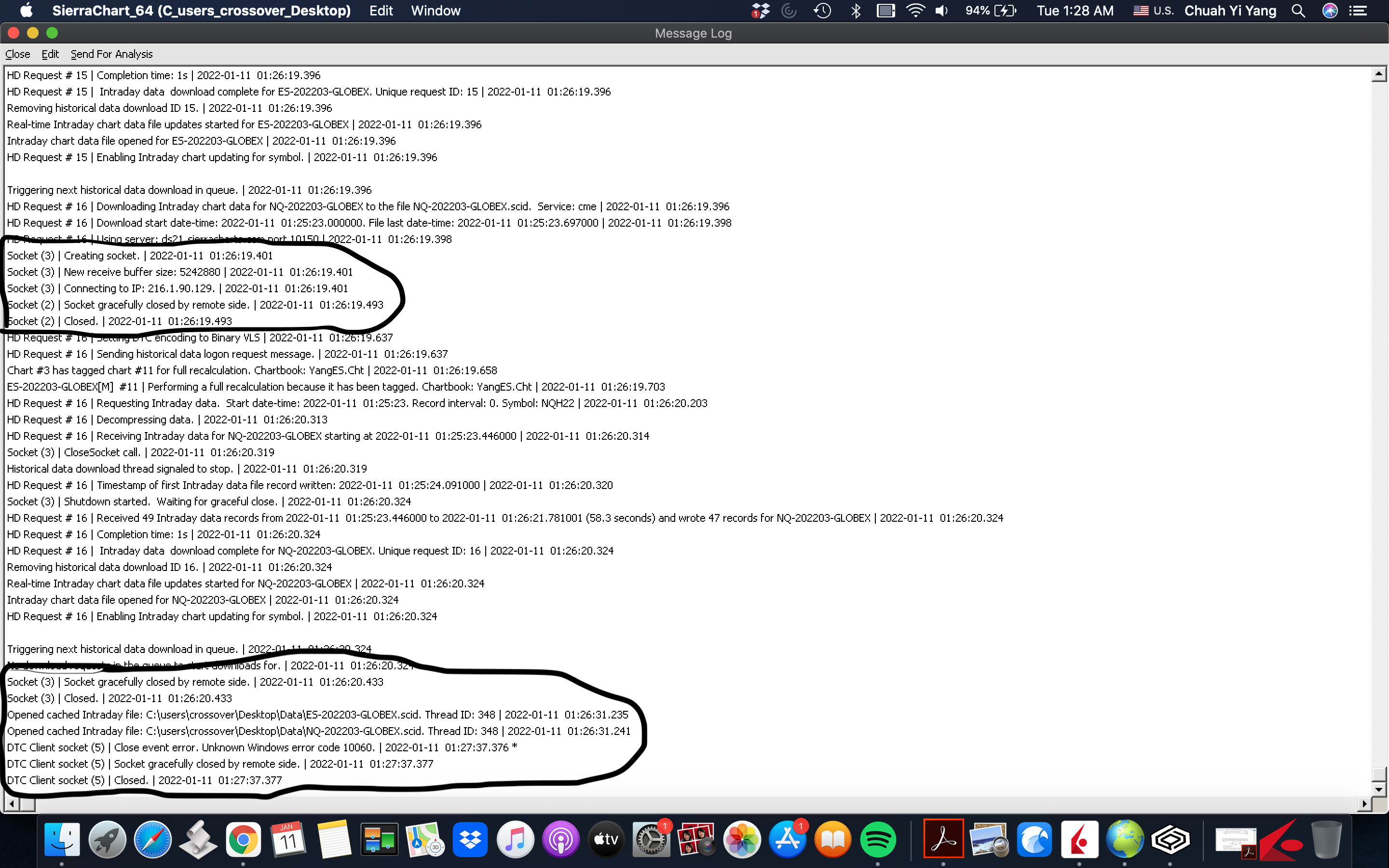 I am referring to the "socket gracefully close and data feed disconnected error". I've shut down my SC so I wouldn't be able to retrieve the full message. But it should be quite obvious from the screenshot I attached.I will attach the screenshot with the error circled out again.