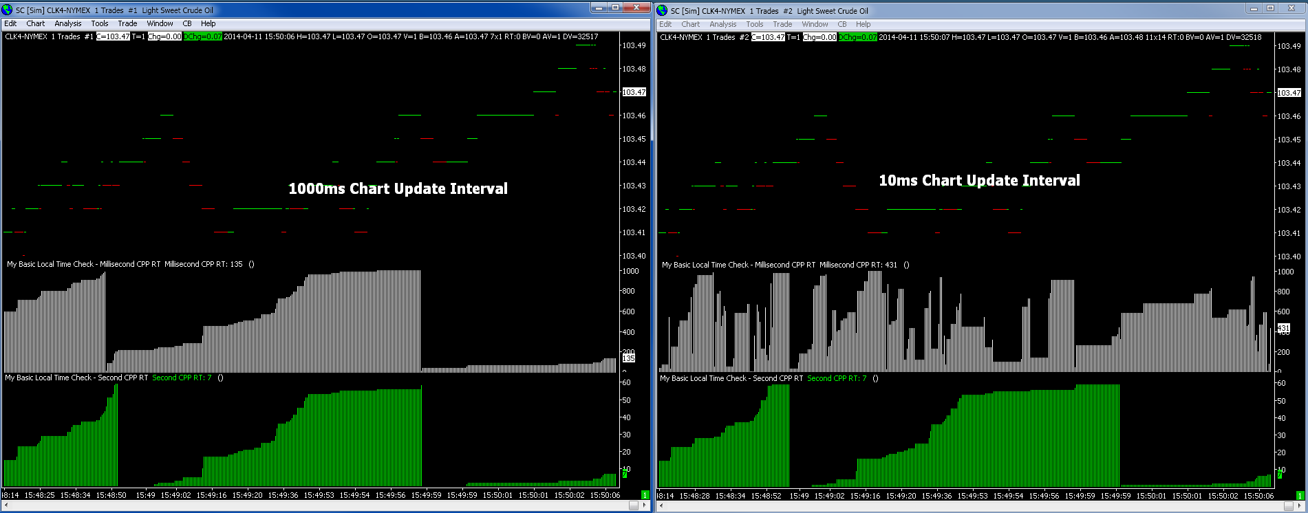 I used the latest 1119 SC version to make the attached picture. Charts are the same 1 Tick bars of CLK4. Chart on the left is set to 1000ms chart update interval and chart on the right is set to 10ms update interval. Bottom green plot is local time "Seconds" part... as can be seen they are not totally identical. Top white plot is local time "milliseconds" part... and here its totally different plots. You can see the milliseconds on the left (1000ms) chart keeps building from 0 value to 999, almost in sync with the "seconds". Also see how this buildup takes almost a full minute to complete. And this is when sc.OnExternalDataImmediateStudyCall = true which should force SC to calculate studies on every new trade data. |