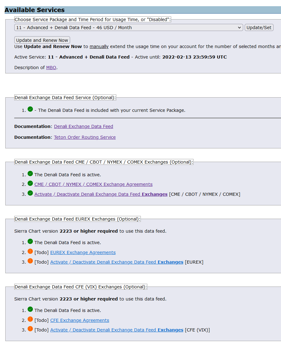 You also need to activate the exchanges that you require here: https://www.sierrachart.com/UserControlPanel.php?page=DenaliDataFeed Otherwise, you will have historical data issues!. Refer to: Rithmic Trading Platform Service: Rithmic Support Policy Sierra Chart Support - Engineering Level Your definitive source for support. Other responses are from users. Try to keep your questions brief and to the point. Be aware of support policy: https://www.sierrachart.com/index.php?l=PostingInformation.php#GeneralInformation For the most reliable, advanced, and zero cost futures order routing, *change* to the Teton service: Sierra Chart Teton Futures Order Routing Date Time Of Last Edit: 2022-01-13 15:00:31