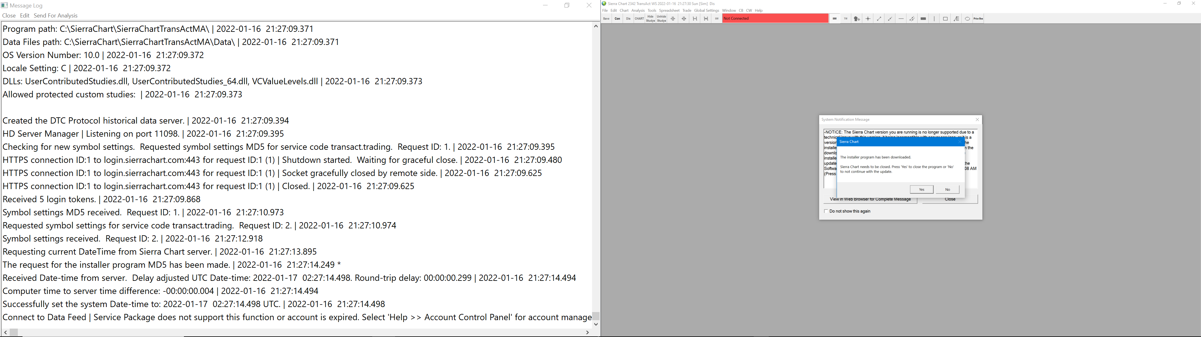 You need to update Sierra Chart to the current version. So you need to click Yes. You should not have any trouble clicking the Yes button and proceeding with the update. Is there any problem occurring doing that? Here are instructions: Software Download: Fast Update Sierra Chart Support - Engineering Level Your definitive source for support. Other responses are from users. Try to keep your questions brief and to the point. Be aware of support policy: https://www.sierrachart.com/index.php?l=PostingInformation.php#GeneralInformation For the most reliable, advanced, and zero cost futures order routing, *change* to the Teton service: Sierra Chart Teton Futures Order Routing |