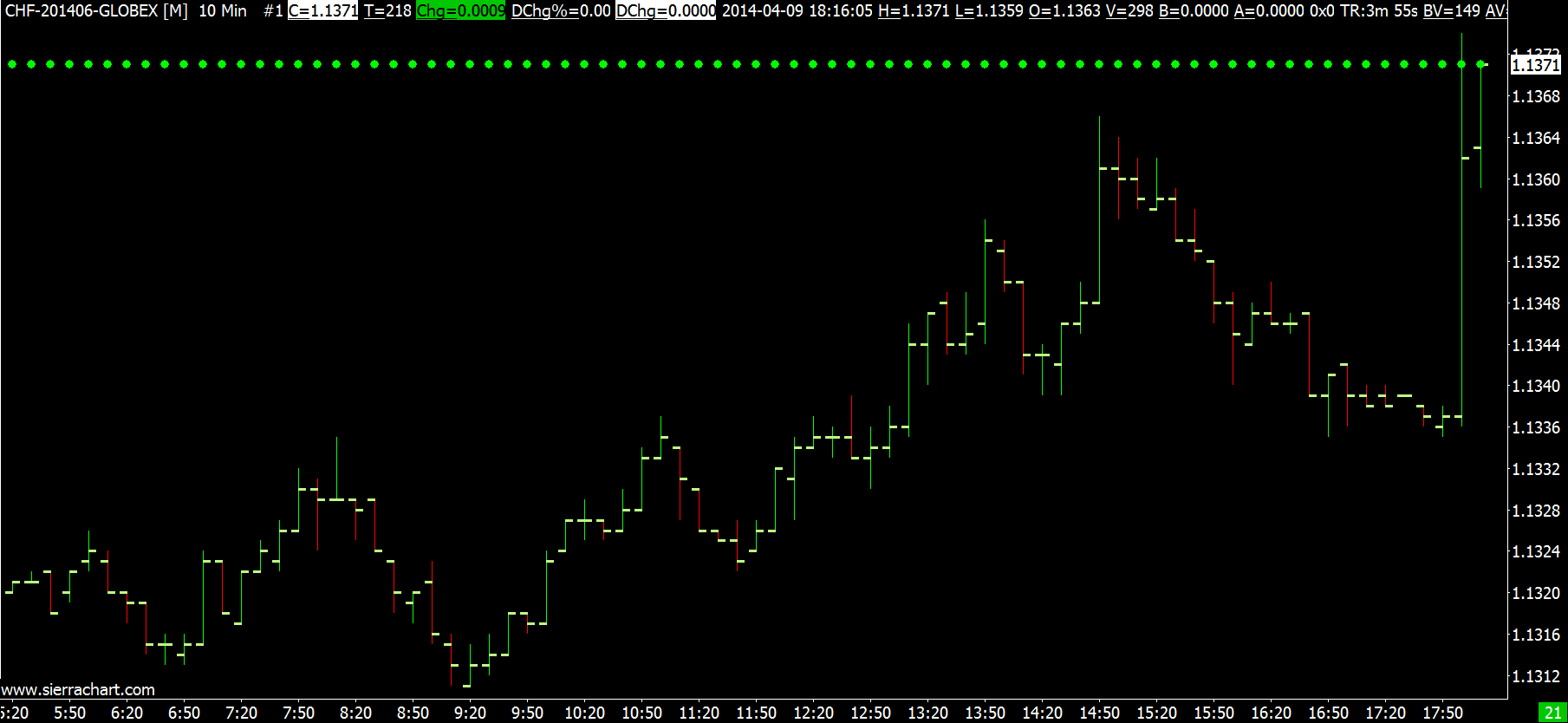 Increase the Number of Bars to Display On study Input with that study. There is also another Input with that study to forward project it. Furthermore, if I change the Line Style to "Dash" or "Dot" and change at the same time the Width/Size to values bigger than "1", then all Line styles are displayed in a solid way. How can I display e.g. a dashed price line, if the Width/Size ist set to values bigger than "1"? This is because it is actually not drawn as a continuous line and when the bar spacing is low you will get this kind of effect. Use the Point Draw Style instead:http://www.sierrachart.com/image.php?l=1397067693886.png Sierra Chart Support - Engineering Level Your definitive source for support. Other responses are from users. Try to keep your questions brief and to the point. Be aware of support policy: https://www.sierrachart.com/index.php?l=PostingInformation.php#GeneralInformation For the most reliable, advanced, and zero cost futures order routing, *change* to the Teton service: Sierra Chart Teton Futures Order Routing Date Time Of Last Edit: 2014-04-09 18:23:35