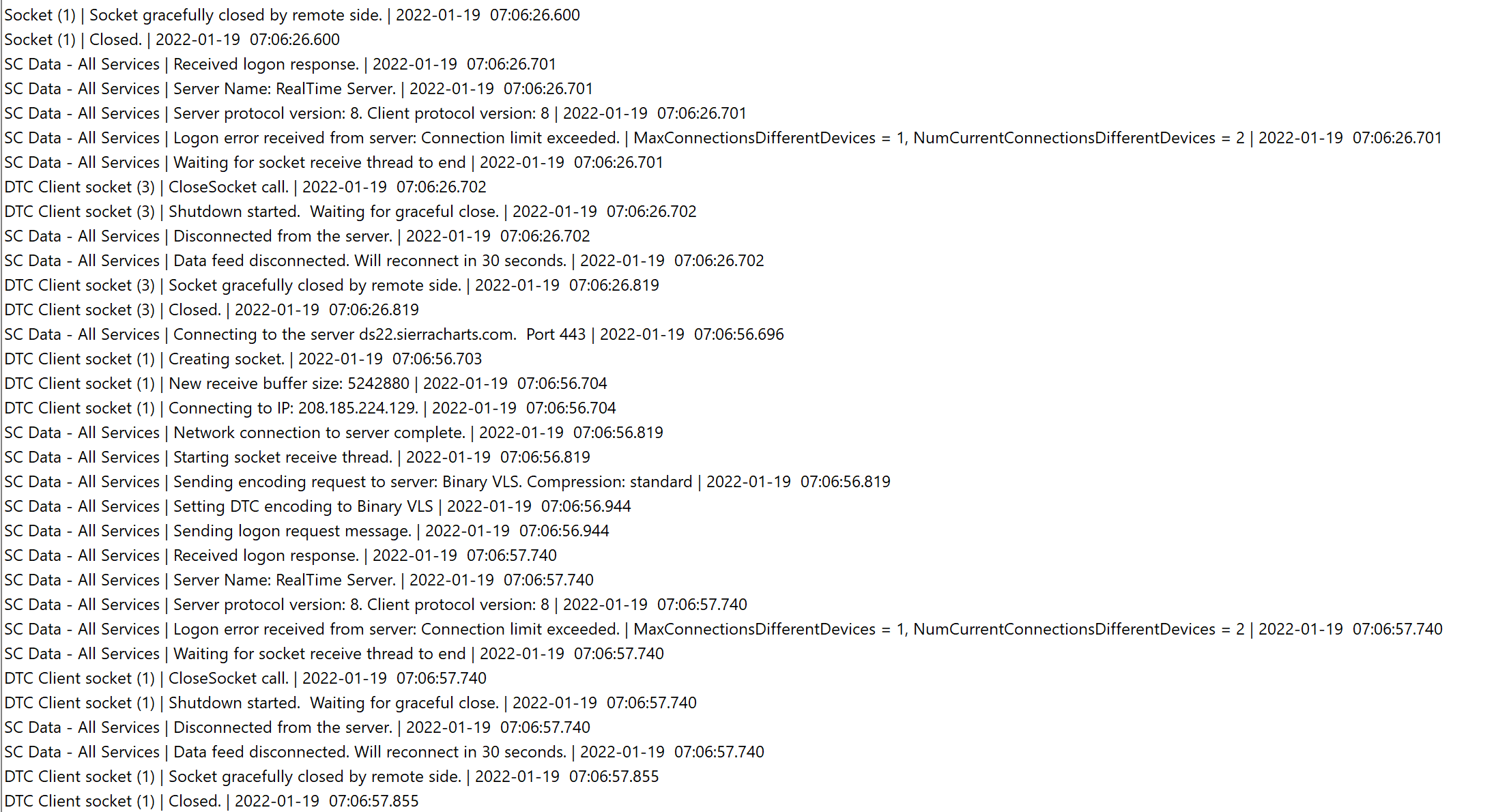 Regarding connections for the Denali Exchange Data Feed, refer to: Denali Exchange Data Feed: Connections Also make sure all of your installations of Sierra Chart are up to date: Software Download: Fast Update Sierra Chart Support - Engineering Level Your definitive source for support. Other responses are from users. Try to keep your questions brief and to the point. Be aware of support policy: https://www.sierrachart.com/index.php?l=PostingInformation.php#GeneralInformation For the most reliable, advanced, and zero cost futures order routing, *change* to the Teton service: Sierra Chart Teton Futures Order Routing Date Time Of Last Edit: 2022-01-19 15:03:47