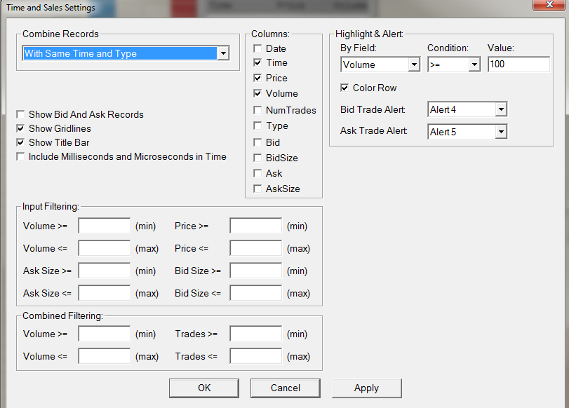 We need to see the settings for both of these Time and Sales windows. And then we have to look at the documentation to understand how the filtering works.