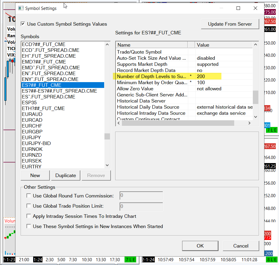 You're welcome. Hopefully we are talking about the same thing. I wanted to see multiple levels of the order book that were not necessarily visible on the DOM or chart because they were too far away. I attached a screenshot of an example. Not a great example from today because the order book is thin but it should show the perspective that I am referring to. The other is the symbol settings you'll need to modify, Global Settings > Symbol Settings. The example on my 3-minute chart shows a "large" order 60 points away. You'd never see that on a range or shorter time frame chart without scrolling for it.
