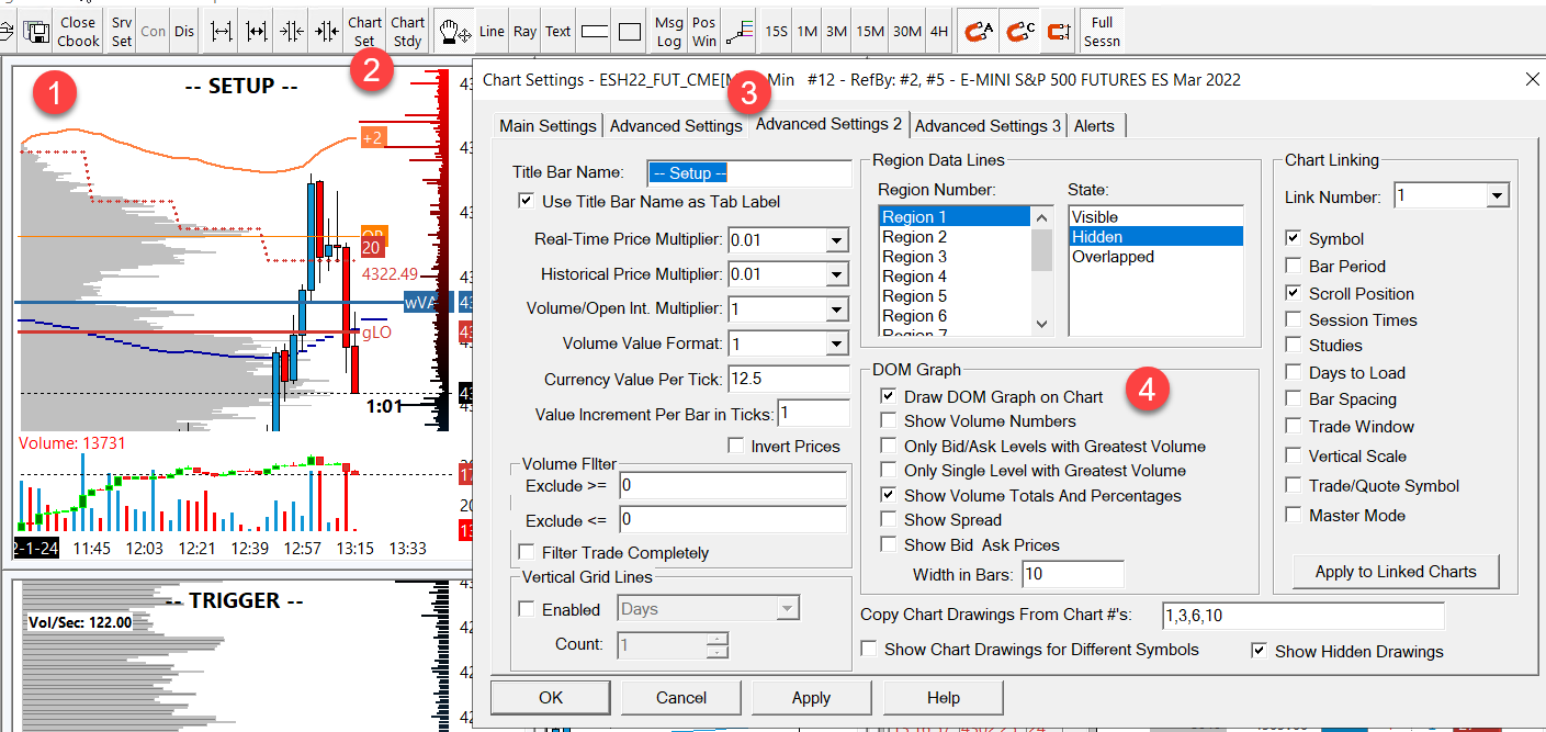 Hey Bootsy, I don't use that bookmark style market depth. It looks cool but I found it was not terribly useful, to me. But to get the order bars on the chart is easy. Select the chart you want to display the bars onto and on the menu bar click Chart Set > Advanced Settings 2 and select Draw DOM Graph On Chart. There are a few parameters there you might like to try. I only need to see volume totals/percentages on the ends. Screenshot attached.
