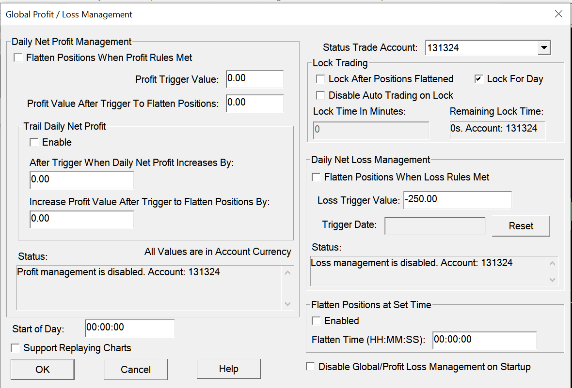 I'm a fellow user. In addition to what you've already entered you need to check "Lock After Positions Flattened", potentially "Disable Auto Trading on Lock" if you're using any automated methods, and "Flatten Positions When Loss Rules Met" Note the Status box in your picture: "Loss management is disabled. Account: 131324" The complete instructions for that window are here: Global Profit/Loss Management |