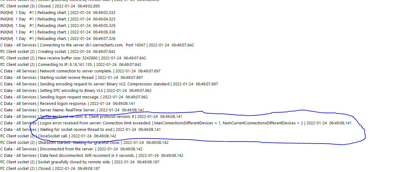 One connection is from Argentina and the other from Canada. Change your password again: https://www.sierrachart.com/UserControlPanel.php?page=ManageAccountInfo And then we will see how to disconnect these connections. Sierra Chart Support - Engineering Level Your definitive source for support. Other responses are from users. Try to keep your questions brief and to the point. Be aware of support policy: https://www.sierrachart.com/index.php?l=PostingInformation.php#GeneralInformation For the most reliable, advanced, and zero cost futures order routing, *change* to the Teton service: Sierra Chart Teton Futures Order Routing |