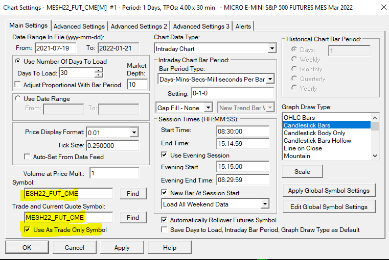 (email from user) Is it possible to have a Chart, Trade DOM, Market Depth/Limit Order Book, Time and Sales showing for e-mini contracts (i.e. ES, NQ) but have trades executed at for the Micro contracts instead (i.e. MES, MNQ)? I've updated the highlighted fields below in the Chart Settings. Date Time Of Last Edit: 2022-01-25 01:48:21