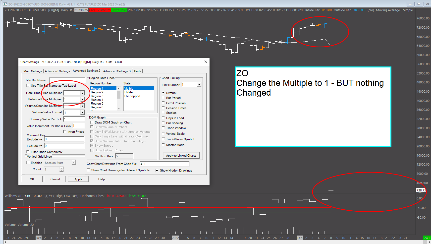 Disable this setting: Global Symbol Settings: Use Custom Symbol Settings Values (Global Settings >> Symbol Settings) And again uncheck this option in the Chart Settings: Chart Settings: Auto Set from Data Feed (Chart >> Chart Settings >> Symbol >> Symbol Settings menu) ( Auto Set from Data Feed) And then set the Multipliers back to 1 in the chart. Sierra Chart Support - Engineering Level Your definitive source for support. Other responses are from users. Try to keep your questions brief and to the point. Be aware of support policy: https://www.sierrachart.com/index.php?l=PostingInformation.php#GeneralInformation For the most reliable, advanced, and zero cost futures order routing, *change* to the Teton service: Sierra Chart Teton Futures Order Routing Date Time Of Last Edit: 2022-02-08 14:28:17