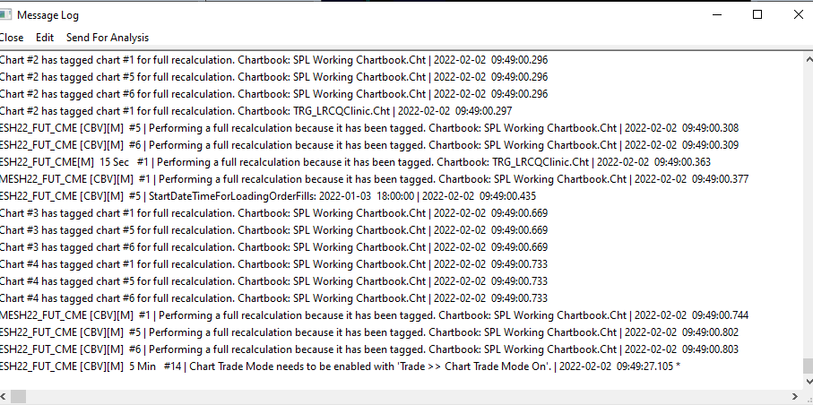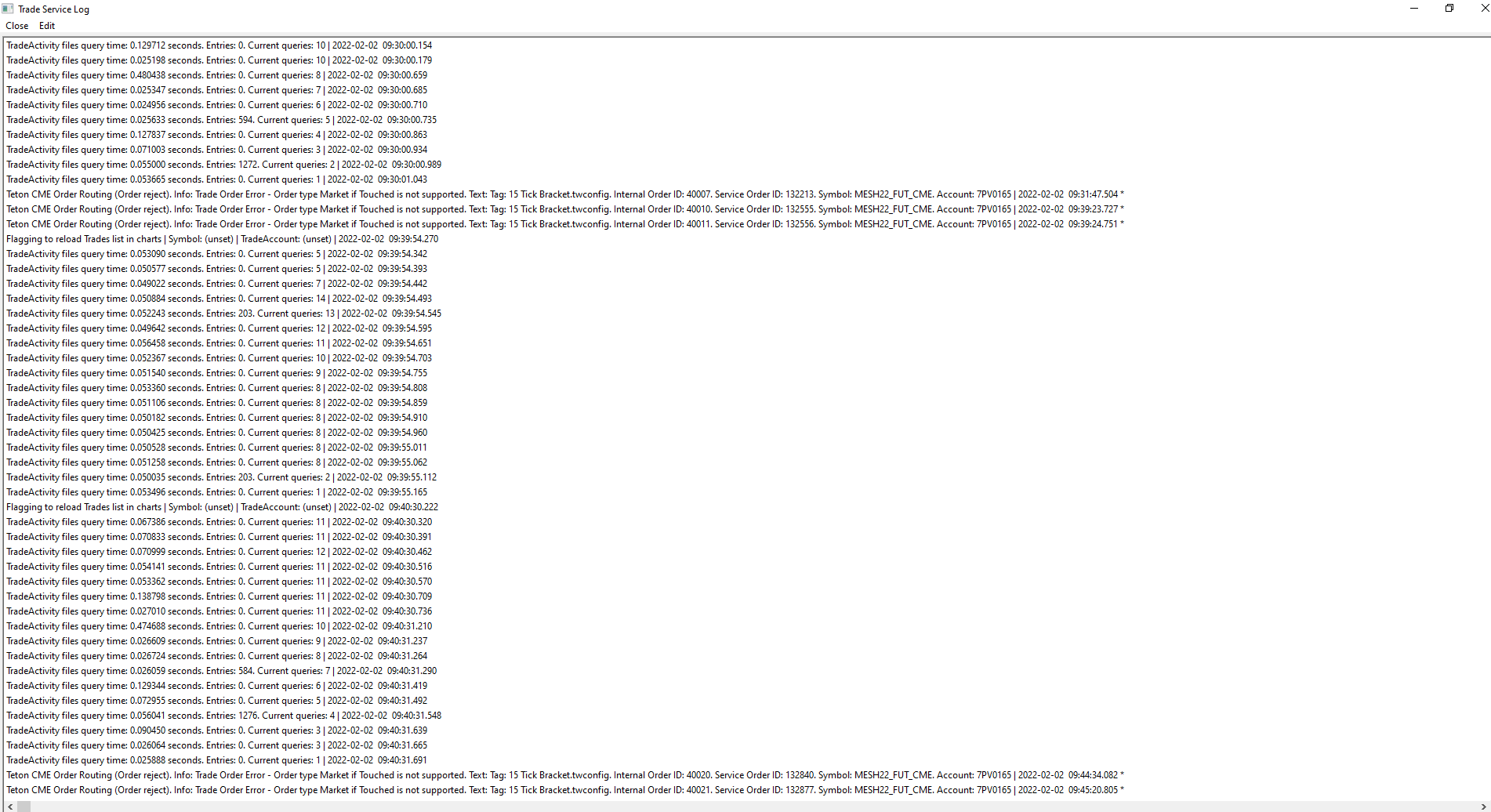 So i switched to Market order if touched and it seemed to work on a couple of trades (SIM and Live) and then it stopped working and gave me an error message stating that he order was not supported. I will attach a screen shot of the service log The other problem i ran into was that to circumvent the issue of the market orders i assigned hotkeys to a numeric pad which works without problem. I was again able to place several (SIM and Live trades without any problems then suddenly i started getting error messages the first was that the trading shortcuts needed to be enabled (which it was). So i unchecked and then rechecked on the Trade DOM. Then i got a different error message stating that the Chart trade DOM needs to be on. I looked for the chart they referred to in the service log and could not find it (also will attach service log) At this point it seems like my only choice would be to go back to Market order if touched client if i want to use the mouse since the two other market order types are not supported. Thank you Steven Leon |