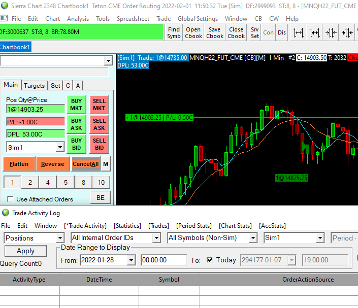 Your question is answered in the Introduction section here: Trade Simulation: Introduction Sierra Chart Support - Engineering Level Your definitive source for support. Other responses are from users. Try to keep your questions brief and to the point. Be aware of support policy: https://www.sierrachart.com/index.php?l=PostingInformation.php#GeneralInformation For the most reliable, advanced, and zero cost futures order routing, *change* to the Teton service: Sierra Chart Teton Futures Order Routing |