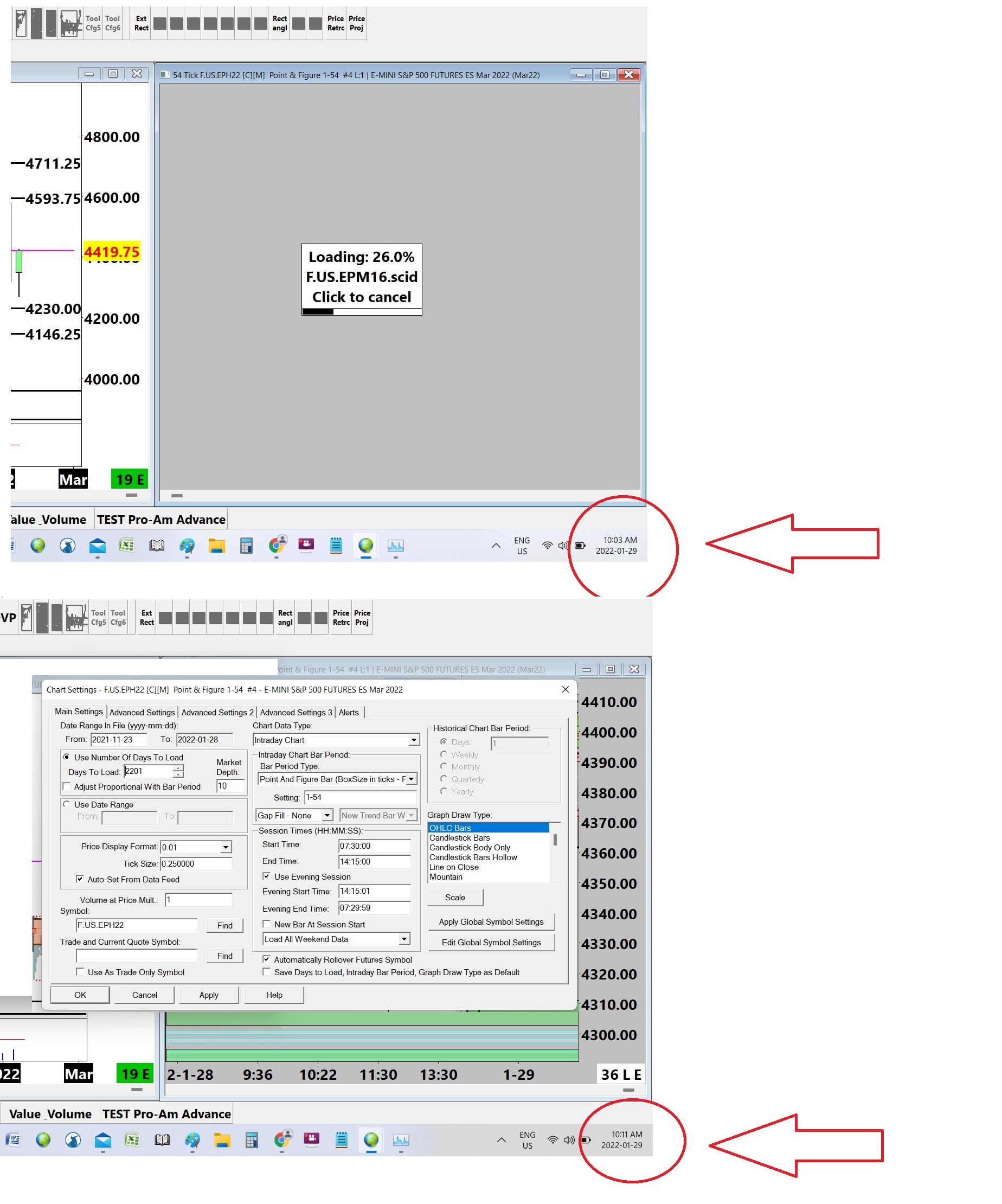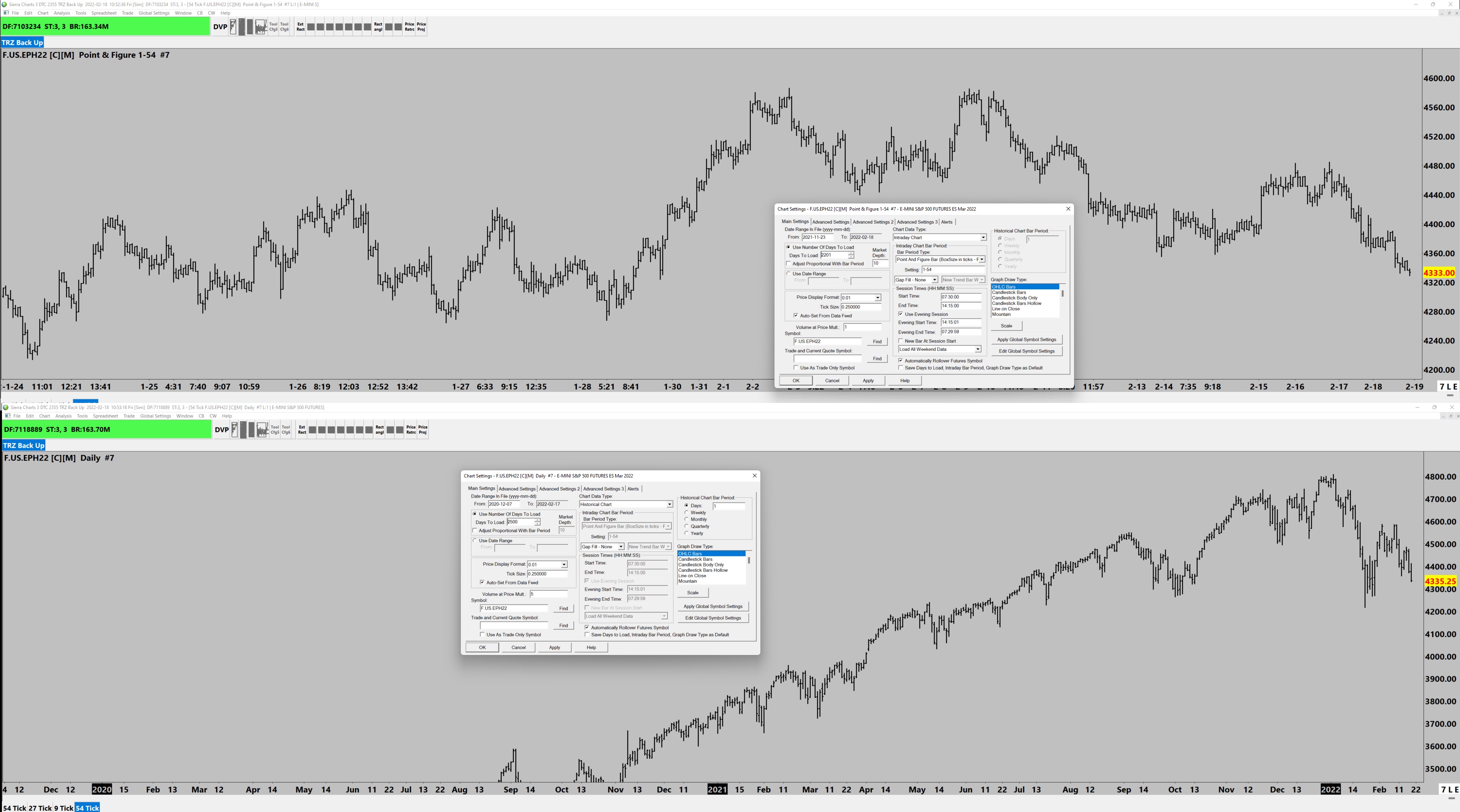 Another question: In my ES chartbook I have a couple of Point and Figure charts. In the attached screen shot the upper chart is a 54 tick PnF chart. I want to load 10+ years of continuous ES data, so, naturally it takes a long time to load. If "historcal data" is used, the chart automatically changes to a daily chart and that data defaults to daily data as per the second chart (bottom) I seems that I am "forced" to use intraday data. Isn't there some kind of "historical/intraday data" available, or another way to accomplish this? Kind Regards, Daniel |