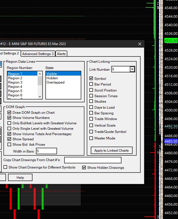 The ability to control the display of the Market Depth data (for both the Bid/Ask Size columns and the DOM Graph) by a set level is now controlled through the following setting: Chart Settings: Chart DOM/DOM Graph: Only Display Market Depth Above/Equal Quantity (Chart >> Chart Settings >> Market Depth menu) For the most reliable, advanced, and zero cost futures order routing, use the Teton service: Sierra Chart Teton Futures Order Routing |
