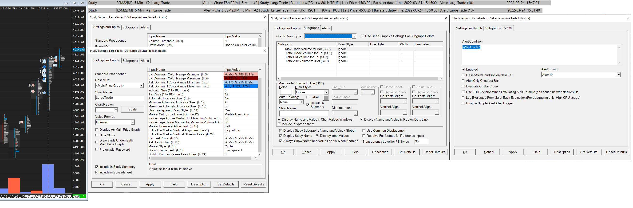 Hi John, Thanks for your response. I set it to 80 for the threshold. I've combined all the screenshots into one picture so you can see it all at once. The left side is the chart of today's ES. If you look at it, you see the last few bars have many large volumes displayed but it only generated 2 alerts from the Alert Manager (top of the picture). The rest are the 3 tabs of the settings for the study itself. From the log, it looks like it only alerts once per bar. I tried with 2 as the threshold to test it with a lower number and it was the same. I also tried the formula (SG1>0) as well - same results, one alert. |