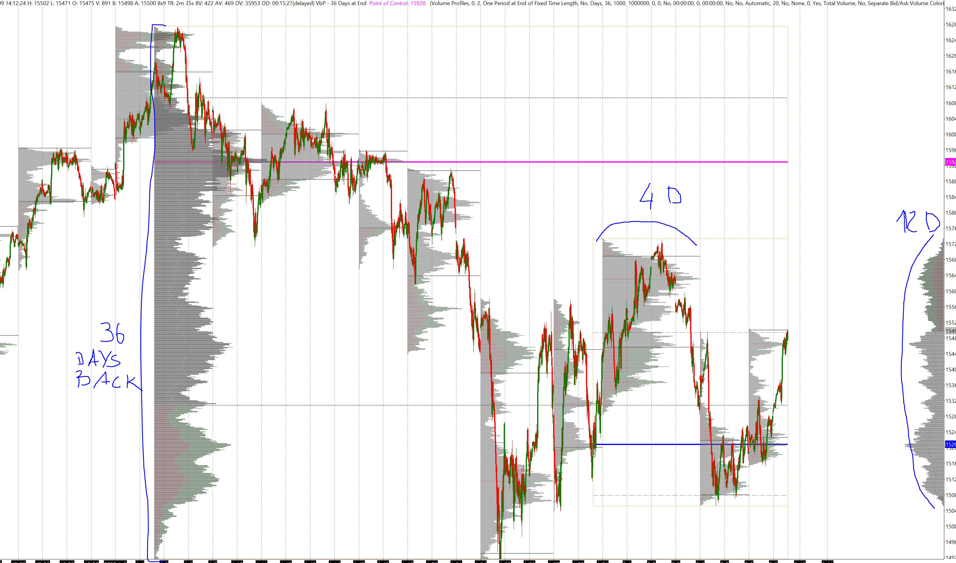 Hello, first of all, the first couple of hours I have start to use the software the impact was quite strange due to the old GUI, but after two days I appreciate a lot the powerful of the software. Slim, fully customisable, full of large number of tools. I am satisfied and I am actually taking in consideration to swithc from Multicharts to Sierra. Some points I have to solve if you can help me. 1) Picture 1. On the left I want a fixed and stady state VP for the last 36 days. I set the left VP as 36 Days back (One Period at End of Fixed Time Length) but as you can see the VP covers onlu 26 days (10 less). On the multiple VP I would 1 VP each 4D so I set Multiple Profiles Based On Fixed Time, Days, 4 but as you can see I have some time 4 days, some times 3 days some times 2 days (weekends?, how I can remow them form VP?) 2) Picture 2. Especially for large workspace, it is impossible to see the different color of each line. I tried to color the border of the VP bar but if I chose for ex green both Bid and Ask portion will be green. I want only the Ask is colored by green and the Bid in red, so in this way I can stress the color of the VP for large charts. Suggestion: if it is possible to fix the stady VP on the left side of the chart and remain there when I zom and pan the chart, would be great. Many thanks Best regards Claudio Donatone Date Time Of Last Edit: 2022-02-09 15:08:49