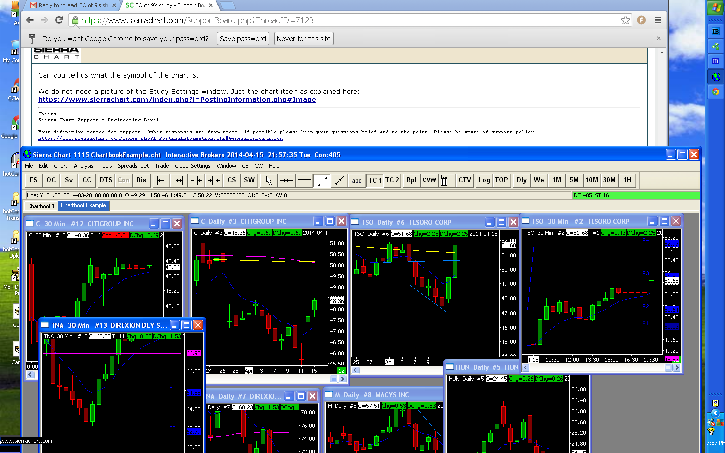 We do not see how using 1 for the anchor value for the Square of 9 study will work. You will need to reset the Anchor Value back to 0 when changing the symbol of a chart. For the chart updating problem, we have answered this in another thread that you started about this. We apologize for the delay. Sierra Chart Support - Engineering Level Your definitive source for support. Other responses are from users. Try to keep your questions brief and to the point. Be aware of support policy: https://www.sierrachart.com/index.php?l=PostingInformation.php#GeneralInformation For the most reliable, advanced, and zero cost futures order routing, *change* to the Teton service: Sierra Chart Teton Futures Order Routing |