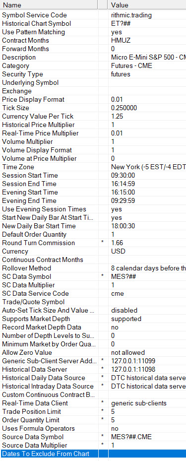 The one thing we see is that your Source Data Symbol is not correct. If you are getting Rithmic data in the Main instance, then your Source Data Symbol needs to be the symbol in the Main instance, in this case, you would want to use MES?##.CME and then make sure the symbol setting for Use Pattern Matching Characters is set to Yes. We really do recommend just using the Denali data, as you can get it to both instances without having to pay anything extra. If you do not have a live trading account, then you can use the following service in order to qualify for the Non-Professional exchange fees: Easy Solution to CME Funded Trading Account Requirement For the most reliable, advanced, and zero cost futures order routing, use the Teton service: Sierra Chart Teton Futures Order Routing |
